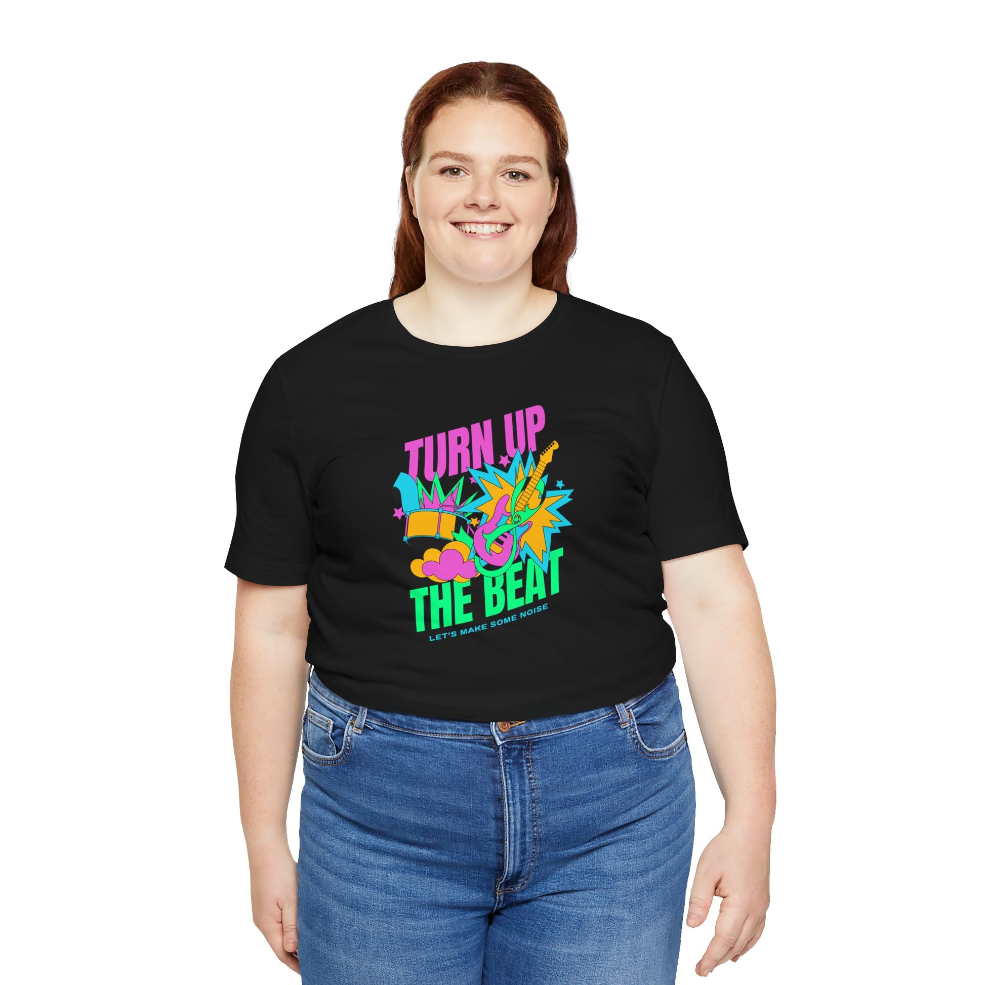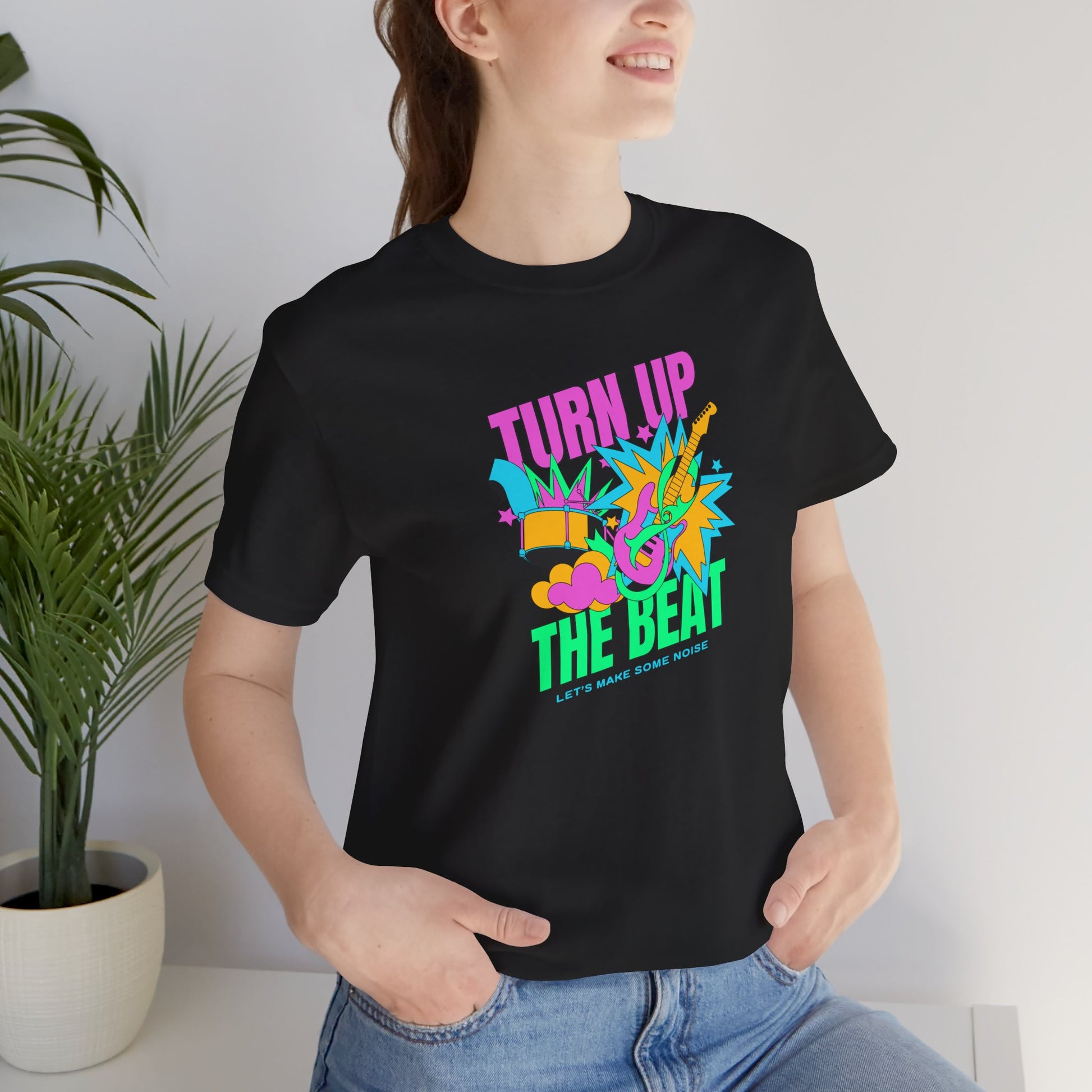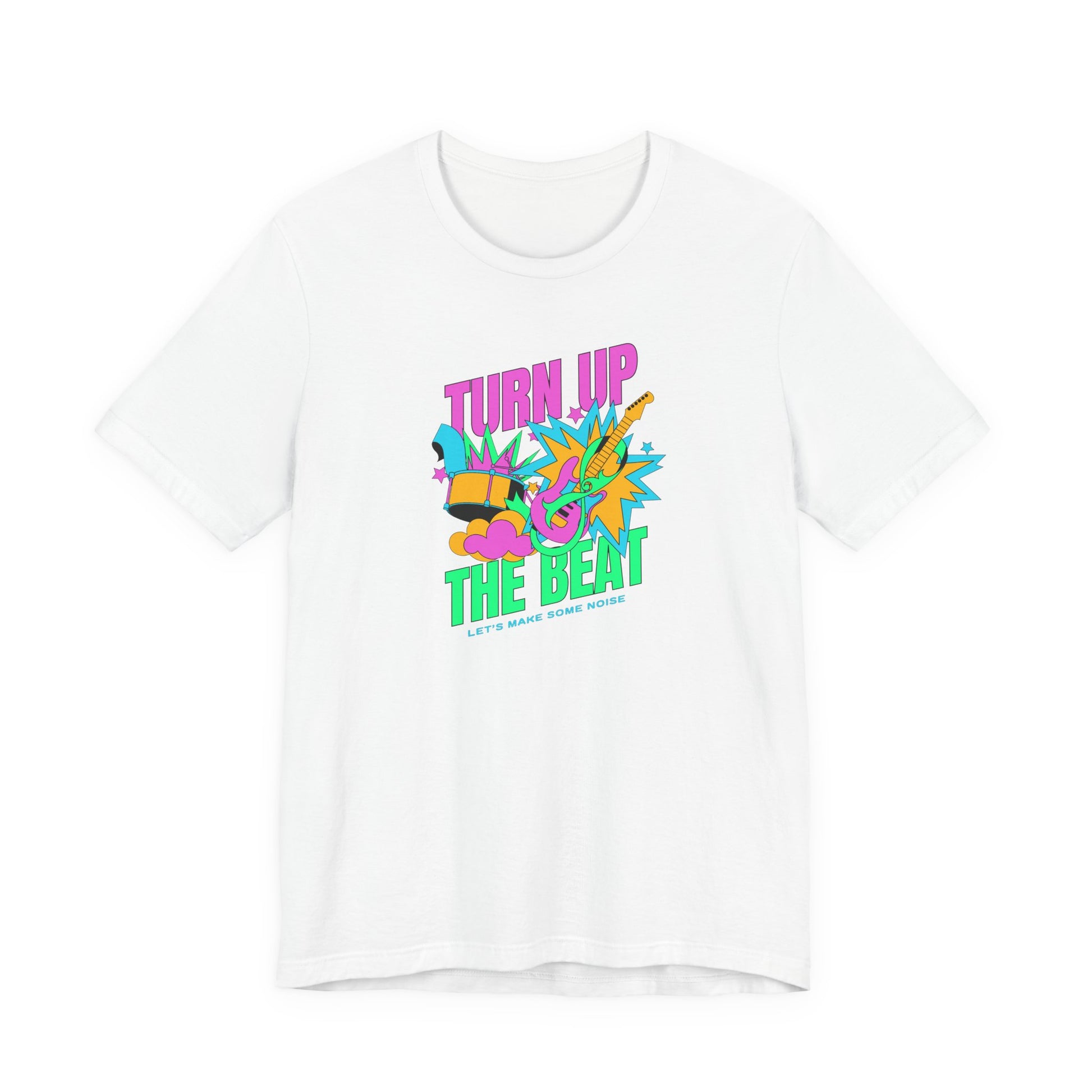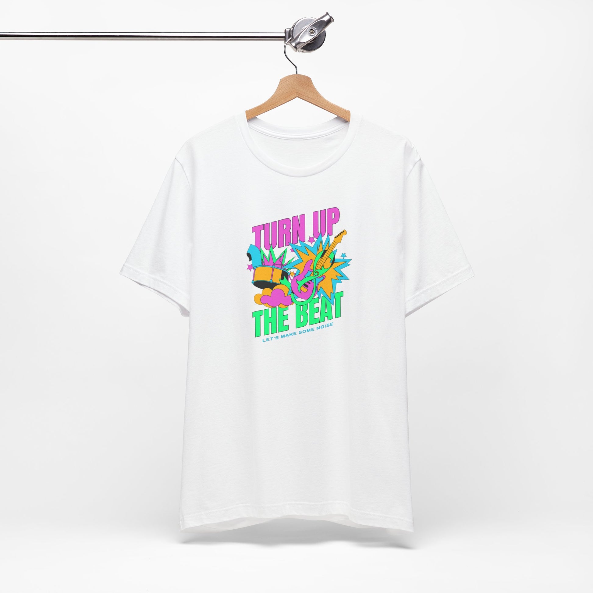 A vibrant graphic tee perfect for music lovers, this Turn Up The Beat Shirt is a unisex music t-shirt that exudes a fun and energetic vibe. It is ideal for casual wear and music-related events, making it a great addition to any music enthusiast's wardrobe.