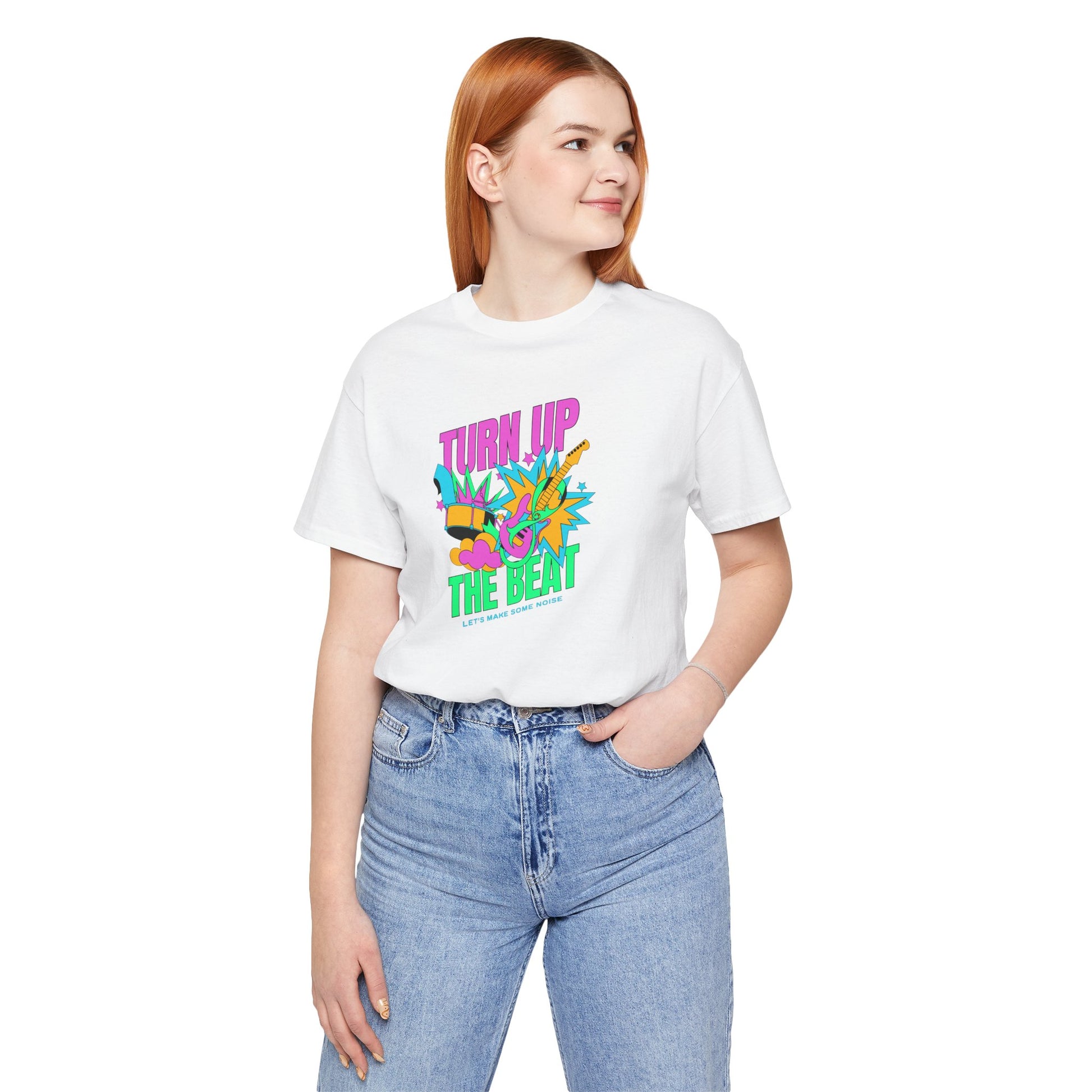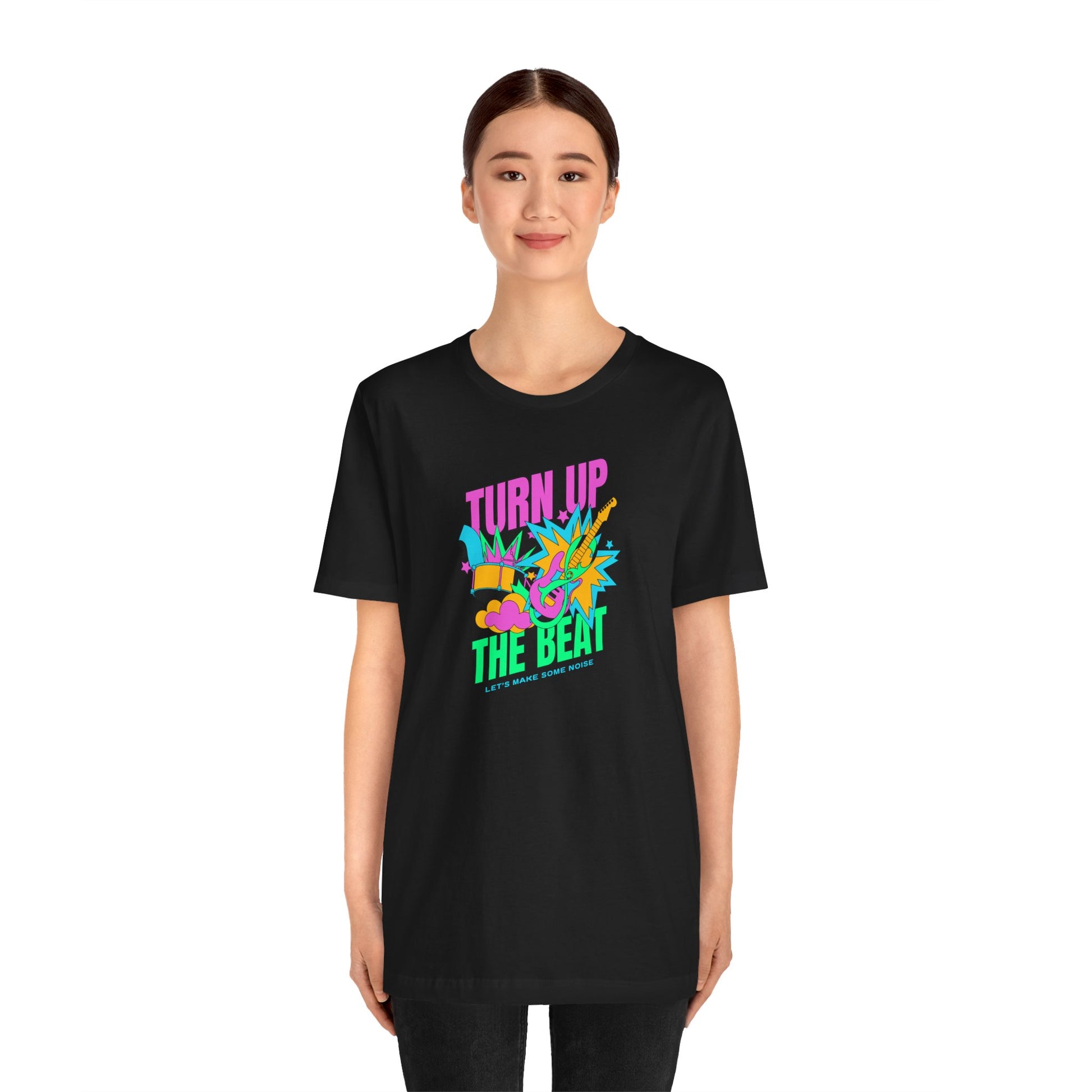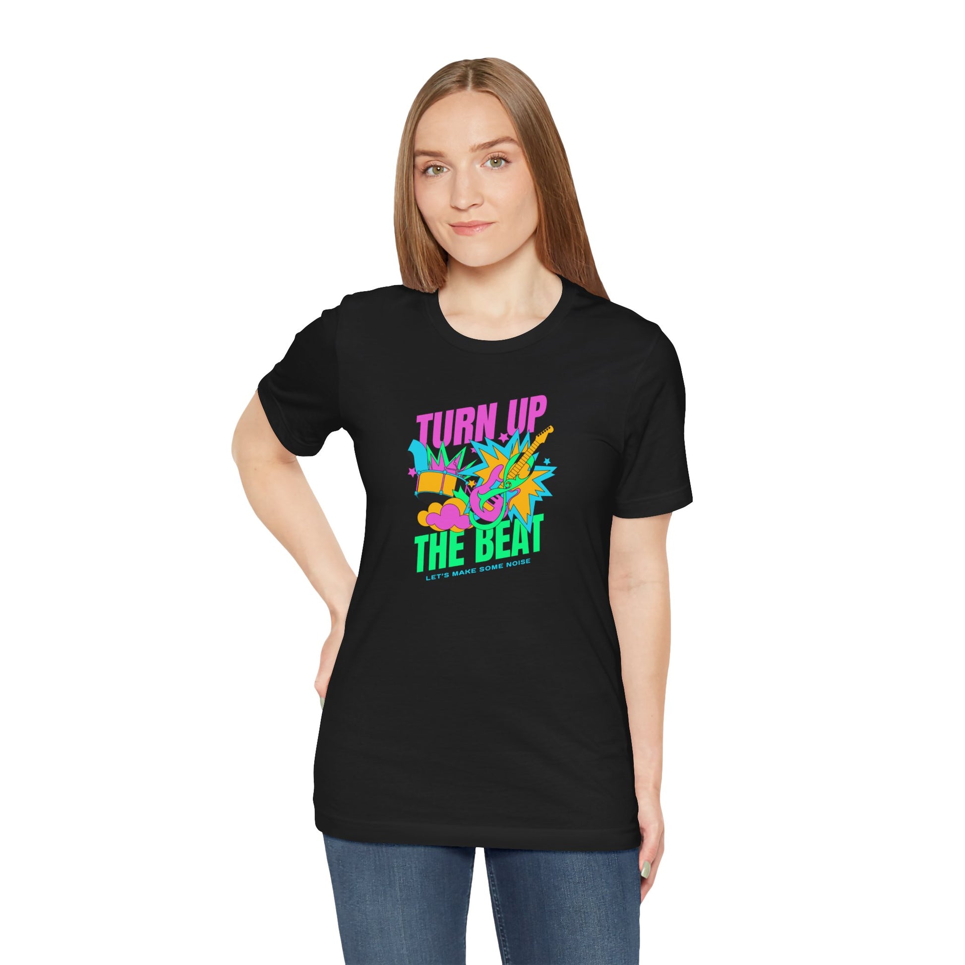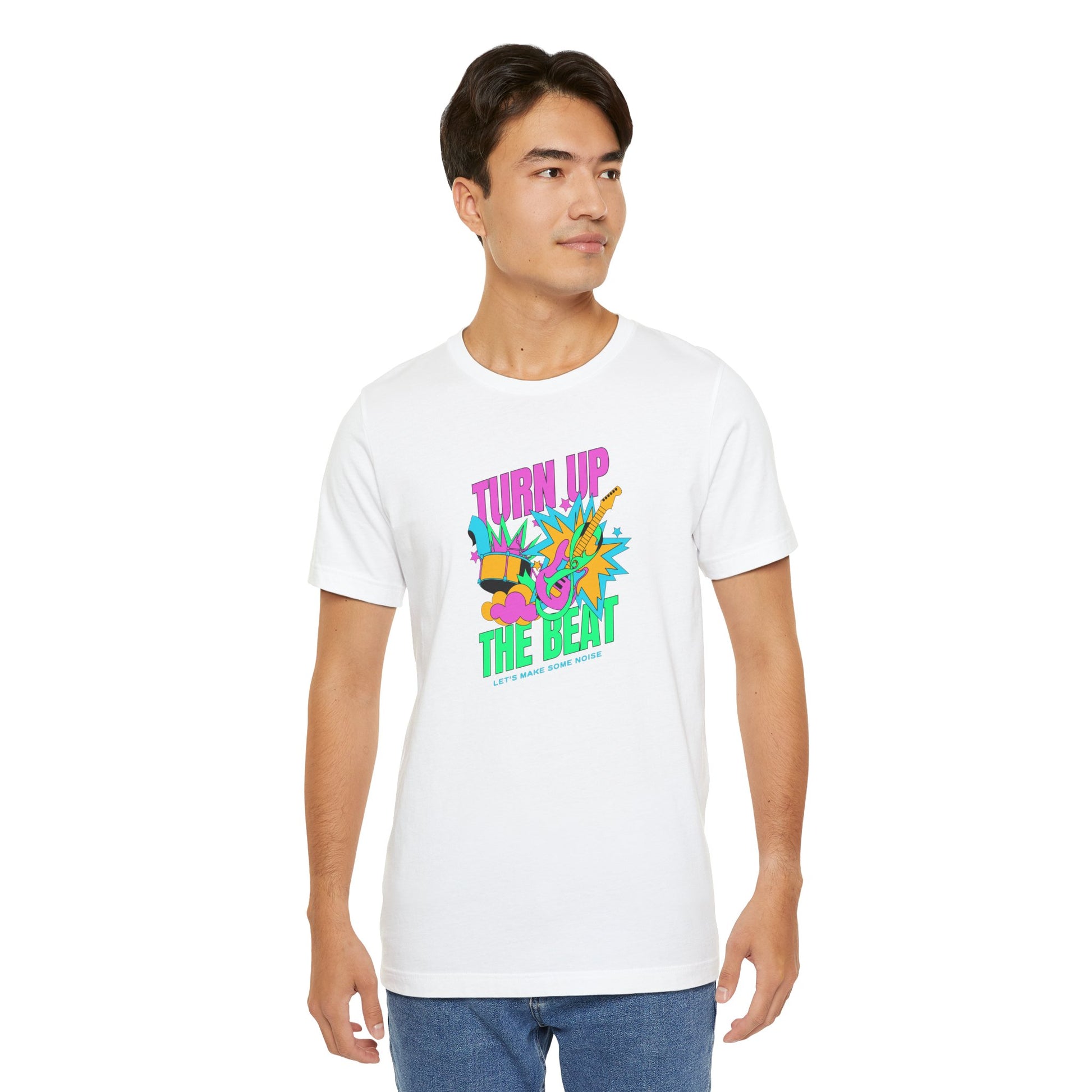A vibrant graphic tee perfect for music lovers, this Turn Up The Beat Shirt is a unisex music t-shirt that exudes a fun and energetic vibe. It is ideal for casual wear and music-related events, making it a great addition to any music enthusiast's wardrobe.