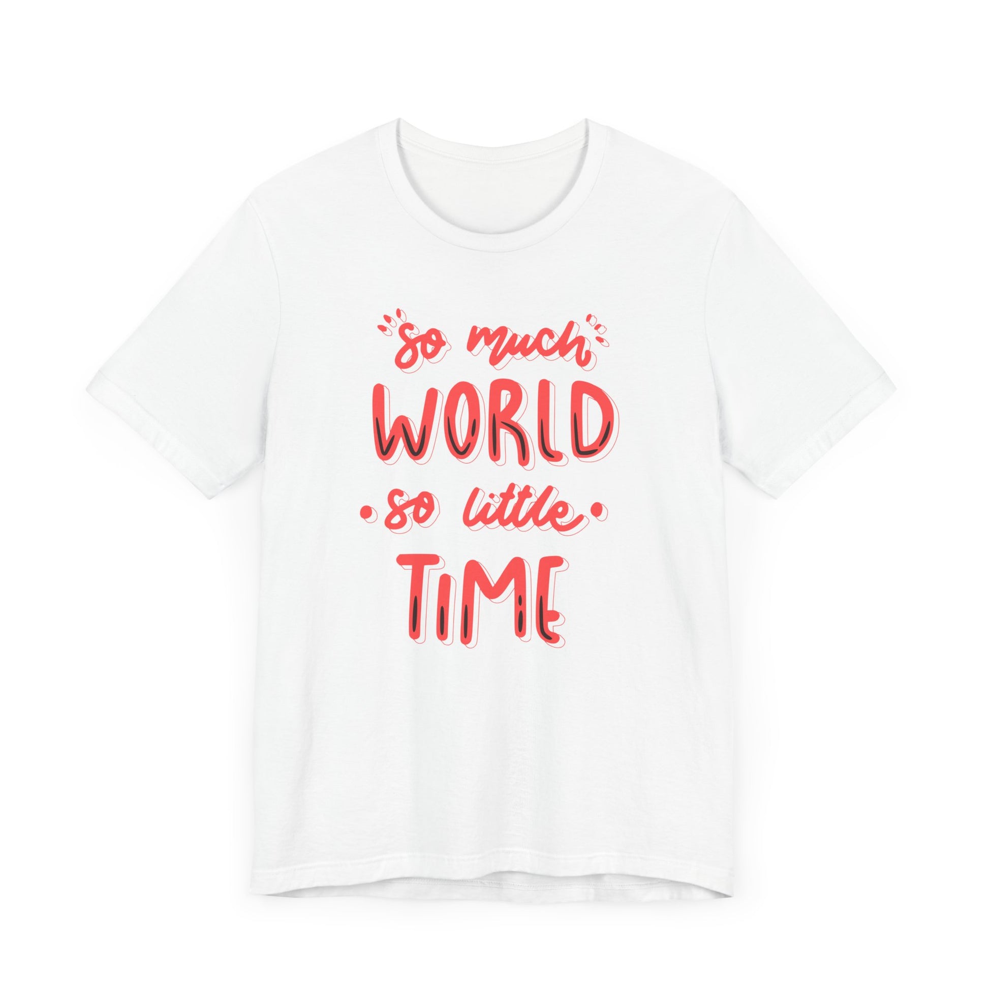 Ce t-shirt unisexe présente la citation « SO MUCH WORLD, SO LITTLE TIME » qui donne un sentiment d'aventure et d'exploration. Fabriqué en 100 % coton peigné et filé à l'anneau Airlume, il est léger et respirant, parfait pour les vêtements de sport et de loisirs. La coupe ajustée et l'encolure ras du cou le rendent adapté aux environnements décontractés et semi-formels. Idéal pour ceux qui aiment voyager et rechercher de nouvelles expériences. Parfait pour offrir en cadeau pour les anniversaires, les vacances ou comme pièce de déclaration décontractée.