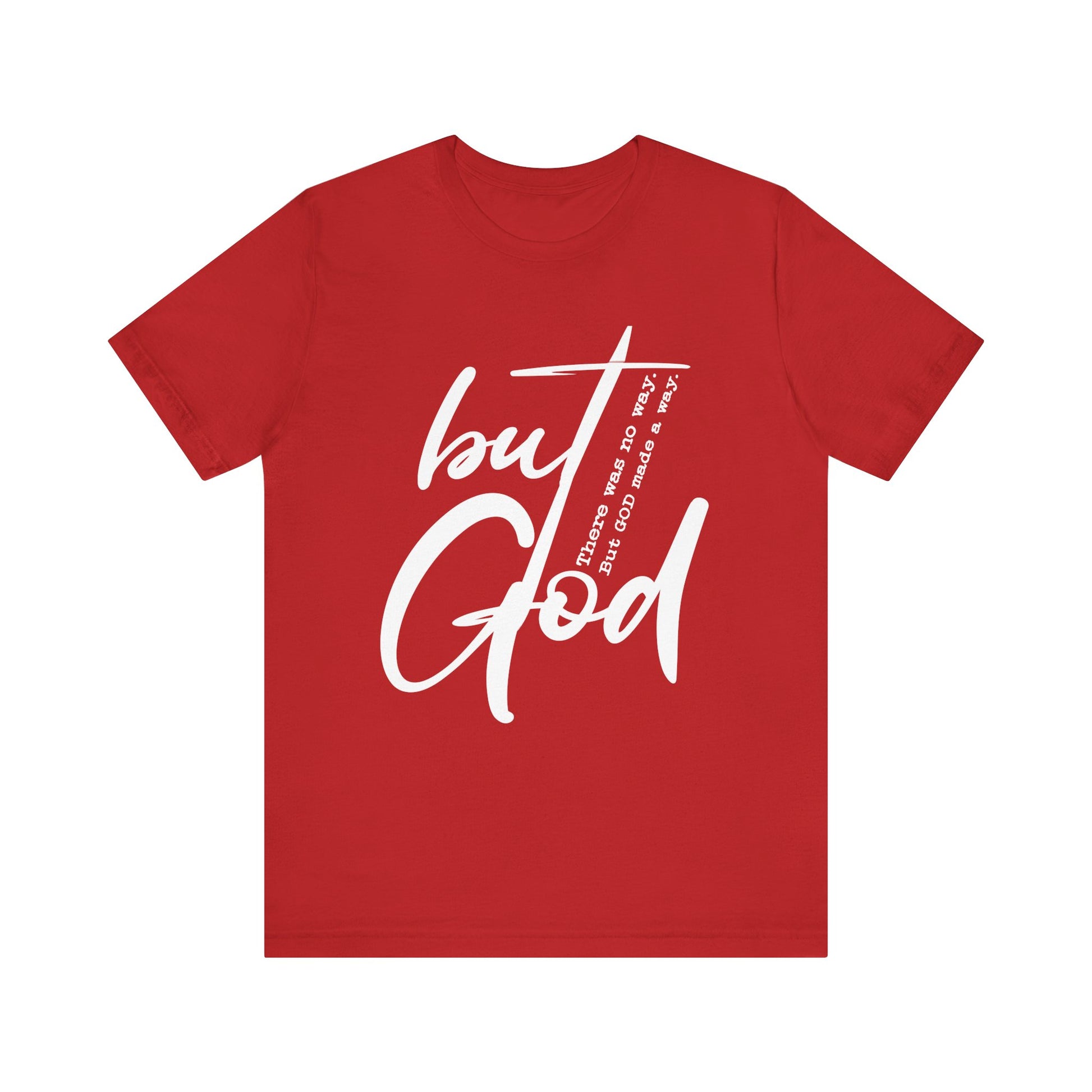 Ce t-shirt à manches courtes unisexe en jersey présente la phrase « But God » pour une ambiance spirituelle et exaltante. Parfait pour un usage quotidien ou comme pièce de déclaration. Convient pour les fêtes et occasions religieuses. Idéal pour ceux qui recherchent un ajout décontracté mais significatif à leur garde-robe.