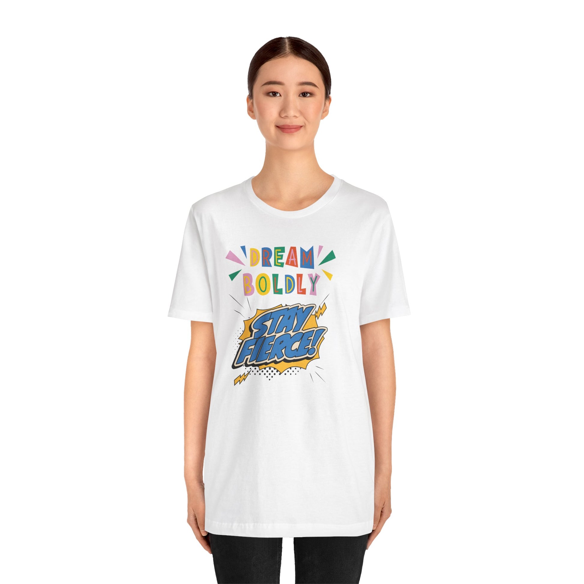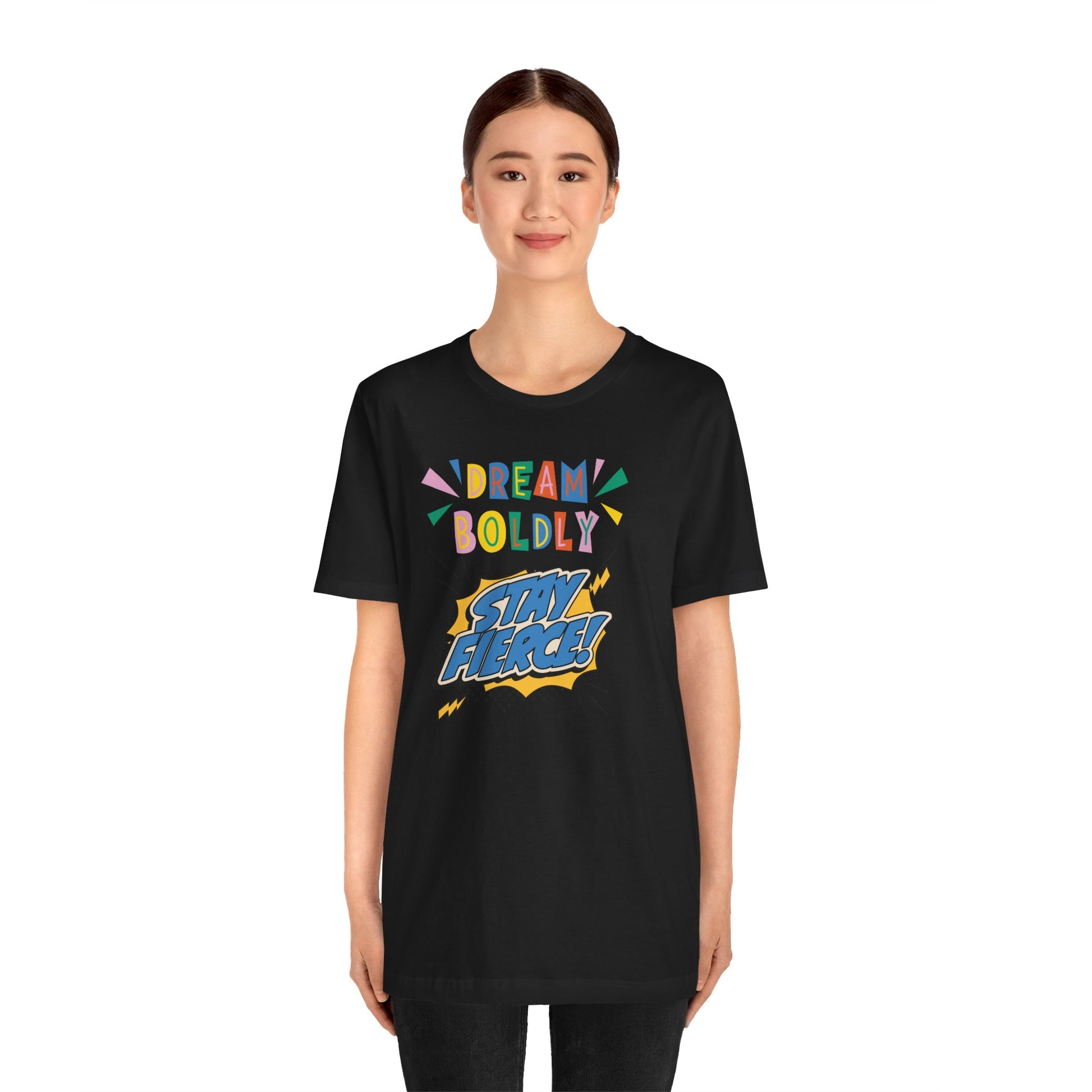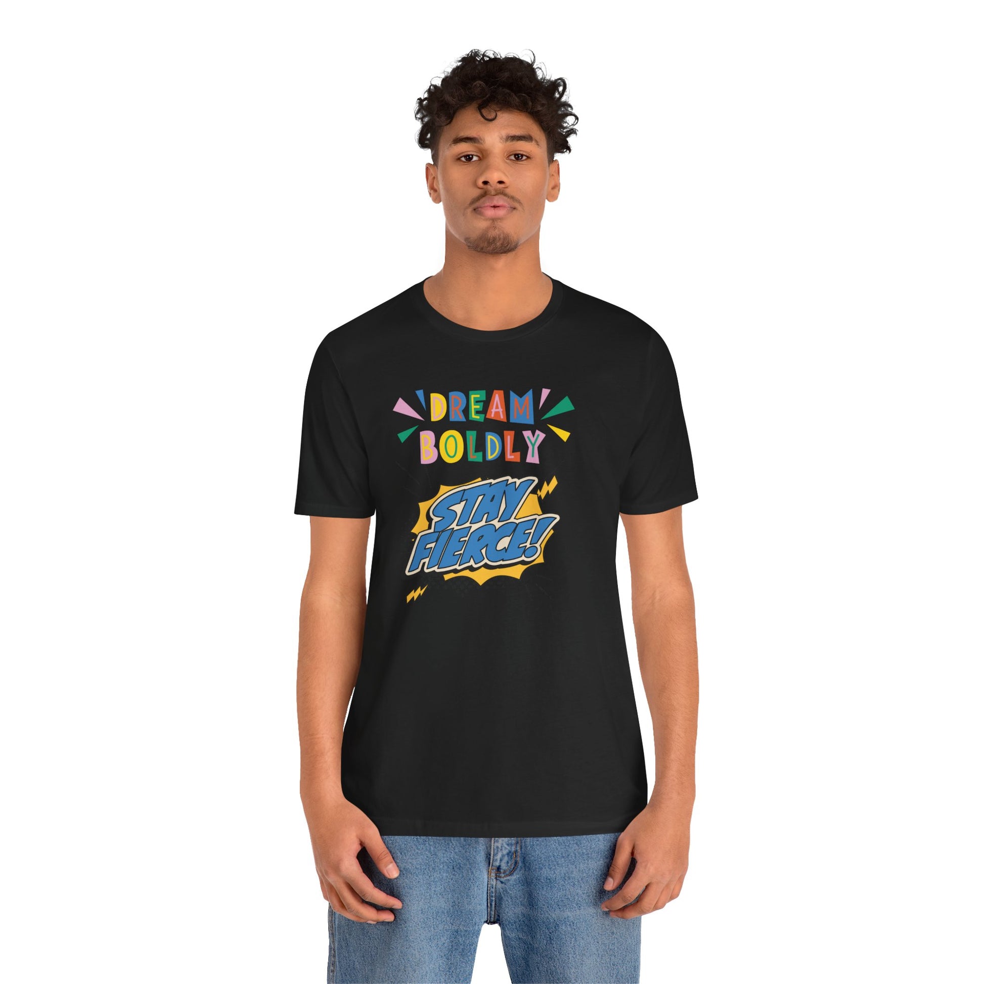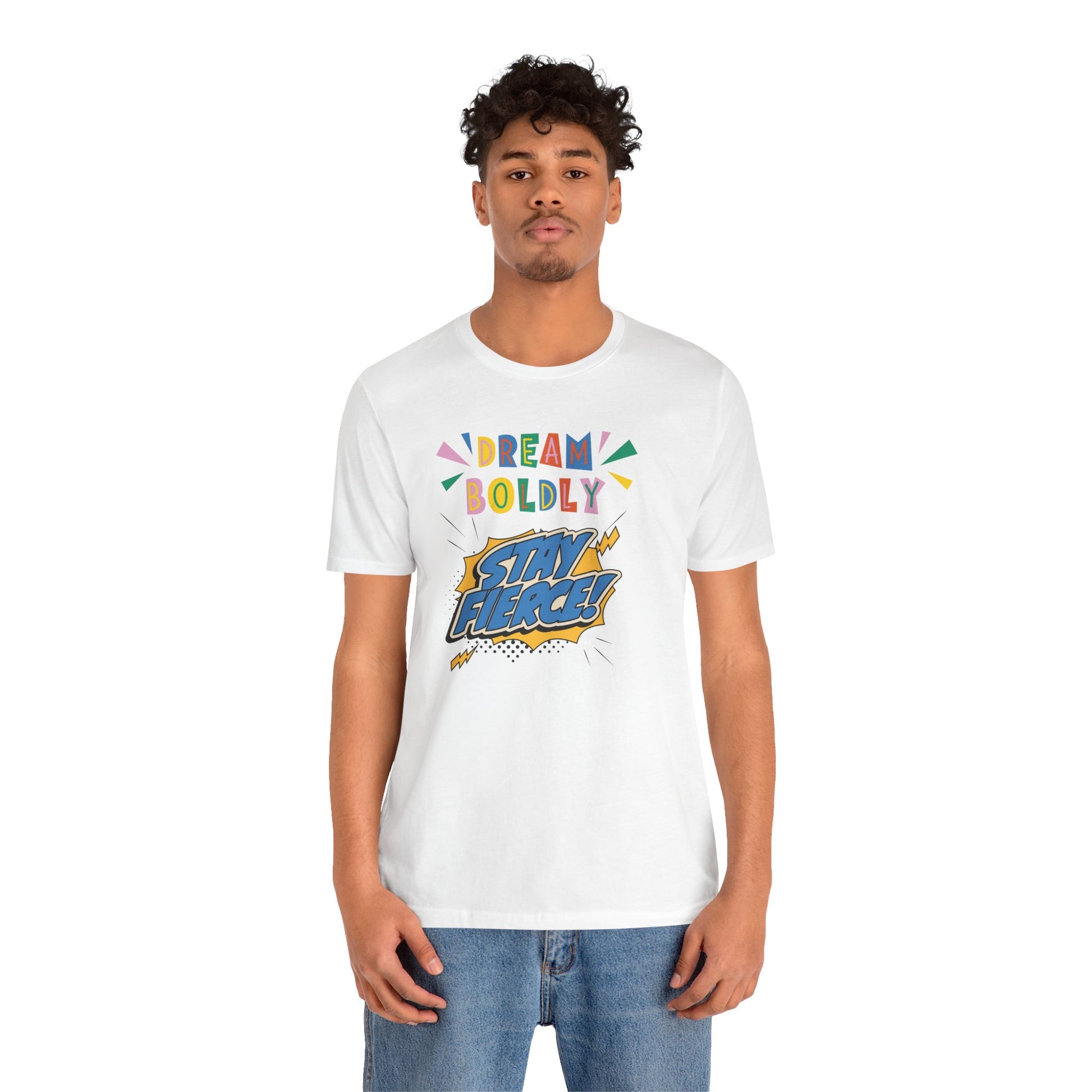 This Unisex Jersey Short Sleeve Tee offers express delivery and features the inspiring message 'DREAM BOLDLY, STAY FIERCE'. Perfect for those who want to make a bold statement with their clothing while staying comfortable and stylish. Ideal for casual wear, lounging, or as a thoughtful gift for a loved one. Relevant to events like birthdays, graduations, and motivational gatherings.