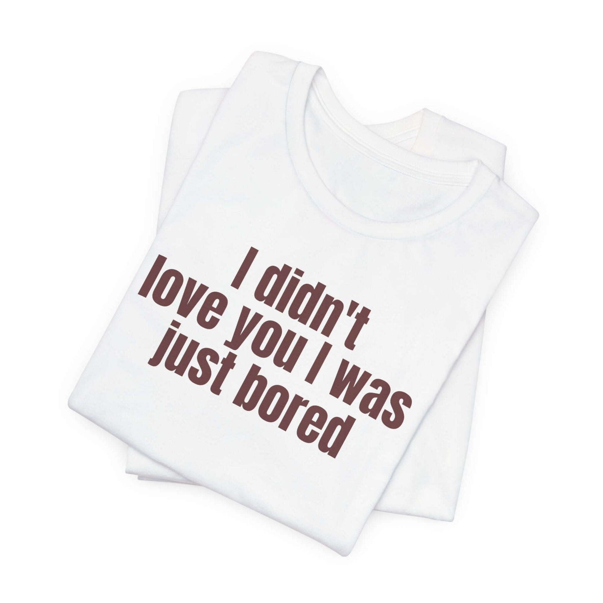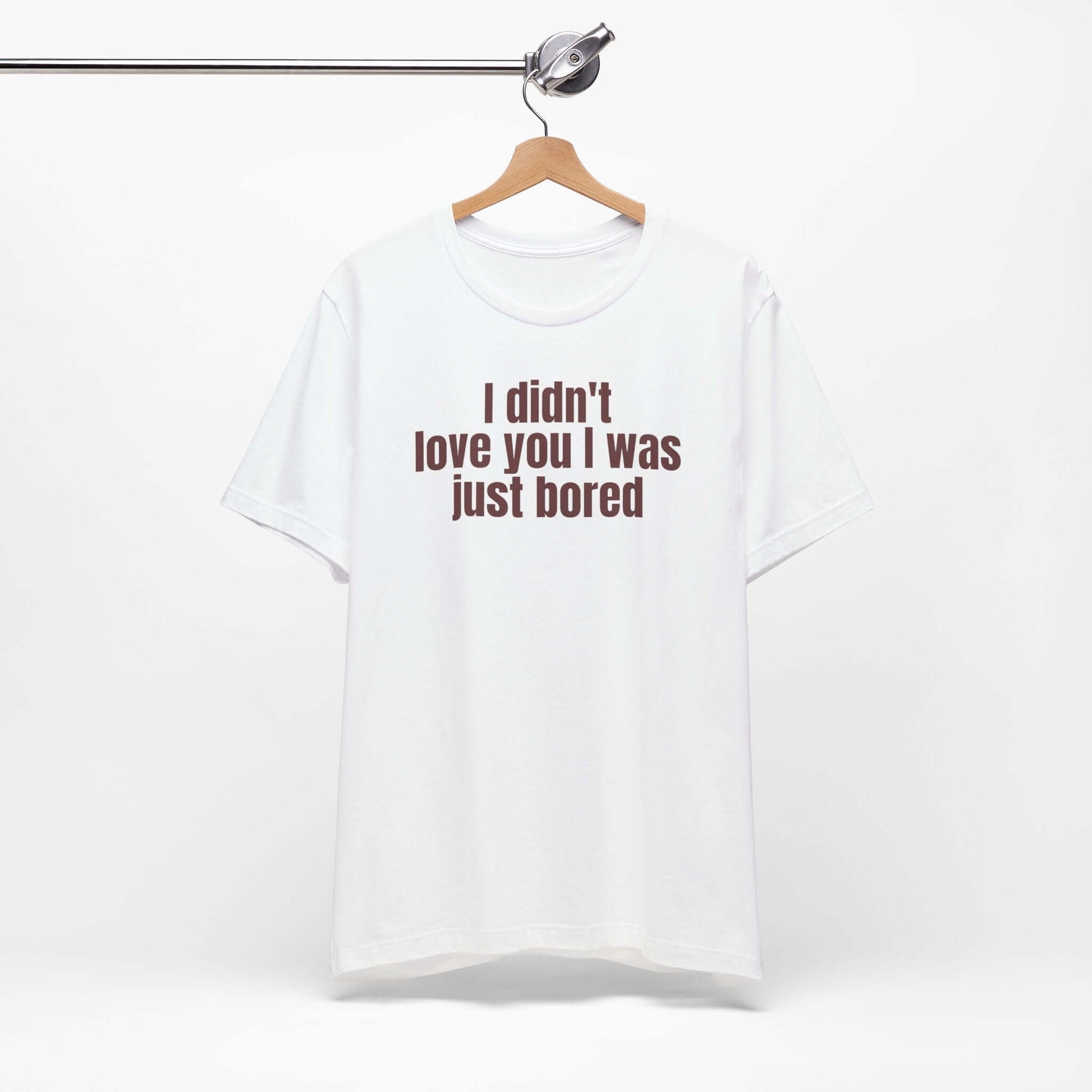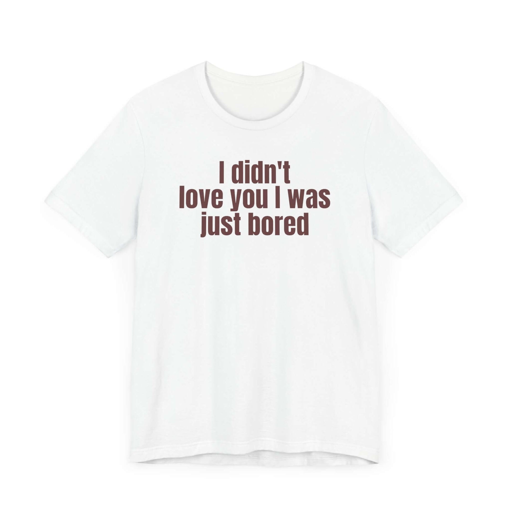 Funny Unisex T-Shirt with the quote "I didn't Love You I Was Just Bored." This tee gives off a casual and humorous vibe, perfect for everyday wear or lounging around. Target audience includes those with a fun sense of humor and laid-back style. Relevant for Valentine's Day, birthdays, or just for a good laugh.