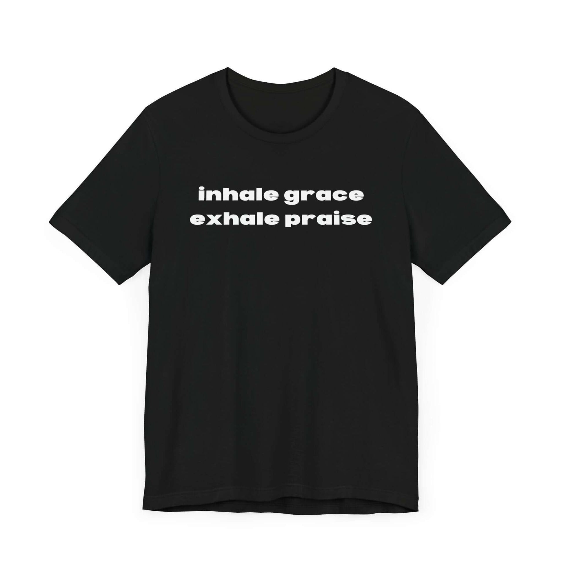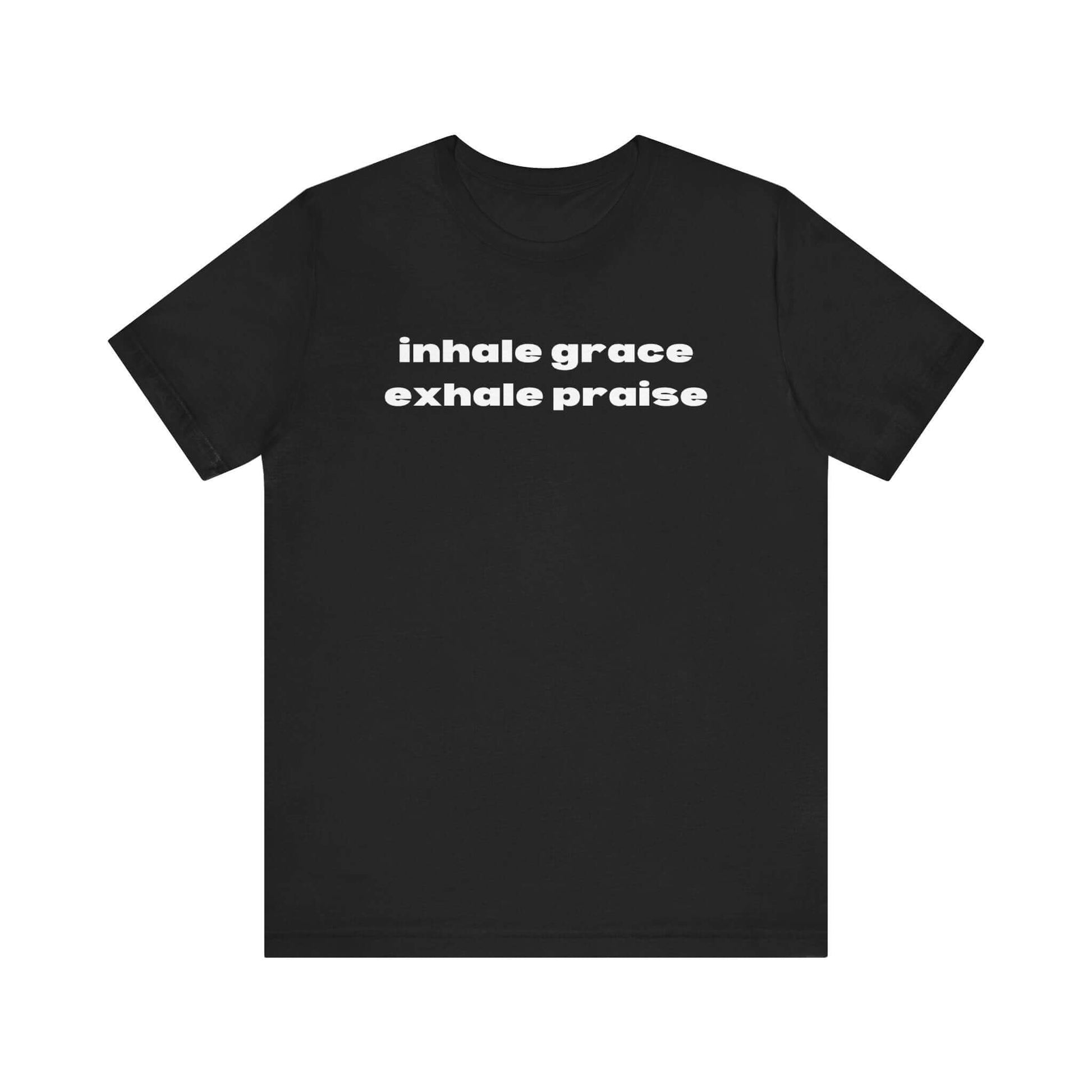 This Inhale Grace Exhale Praise T-Shirt in black exudes a sense of calm and positivity, perfect for those seeking comfort and mindfulness in their daily life. Ideal for spiritual individuals and those who appreciate motivational quotes. Suitable for casual wear and workout sessions. Great for gifting on birthdays, Christmas, Thanksgiving, and other special occasions.