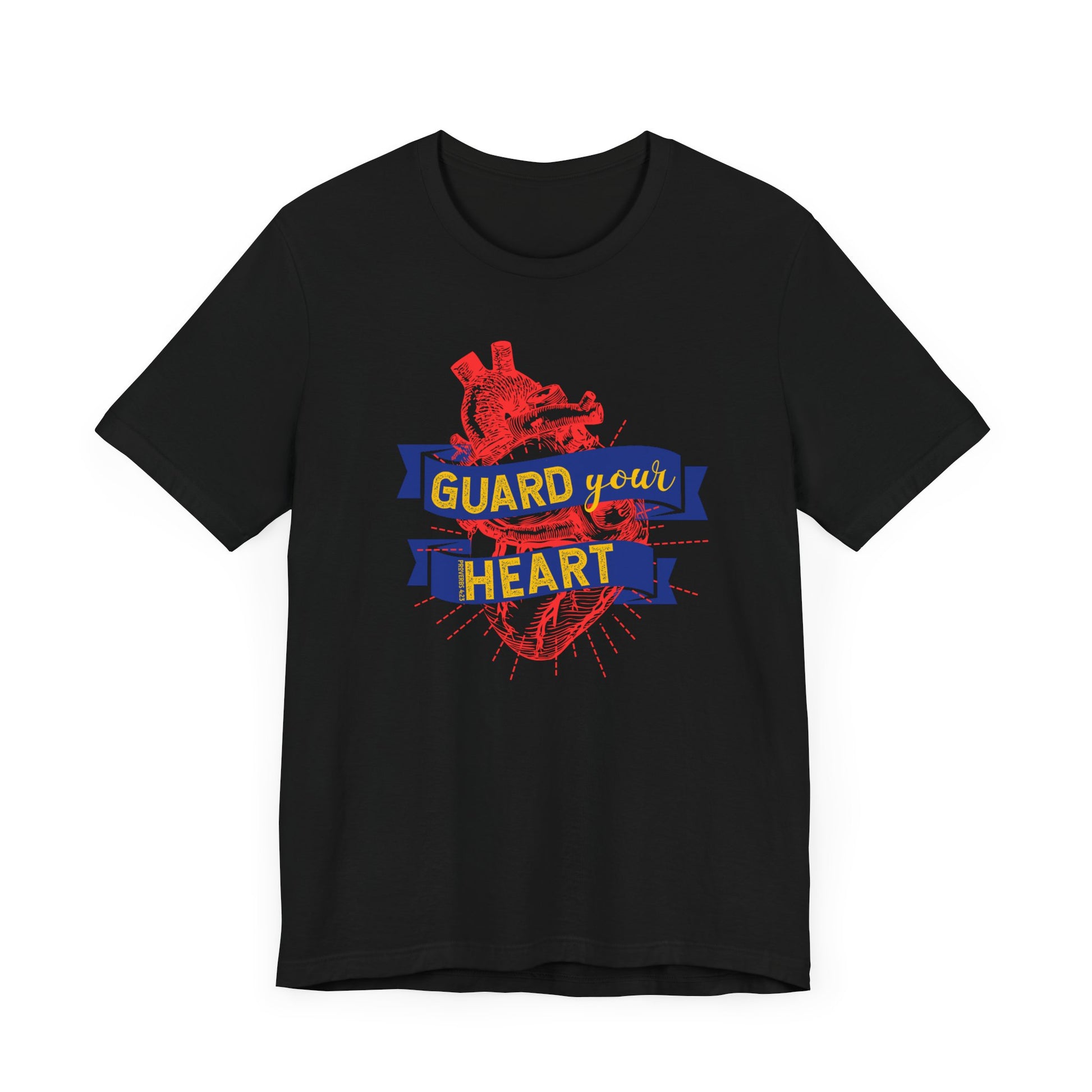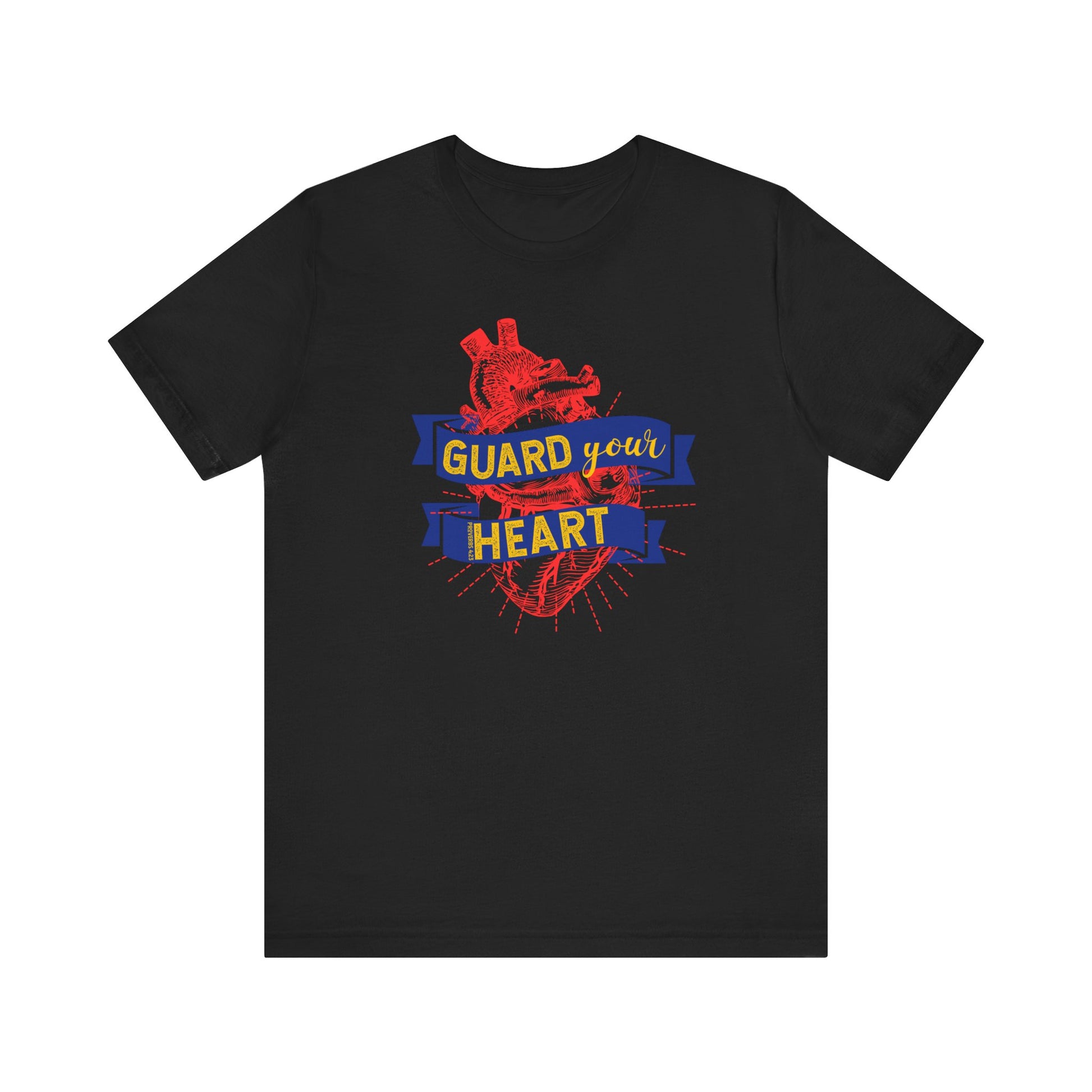 Ce t-shirt unisexe à manches courtes en jersey avec le motif « GUARD YOUR HEART » dégage une ambiance cool et décontractée, parfaite pour un usage quotidien ou des sorties décontractées. Il est pertinent pour ceux qui privilégient le confort et le style dans leur garde-robe. Ce t-shirt convient aux occasions telles que les sorties décontractées, les événements en plein air ou la détente à la maison.