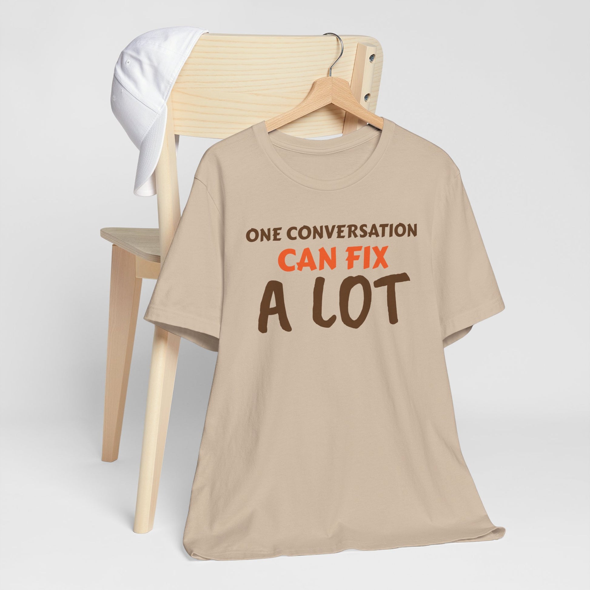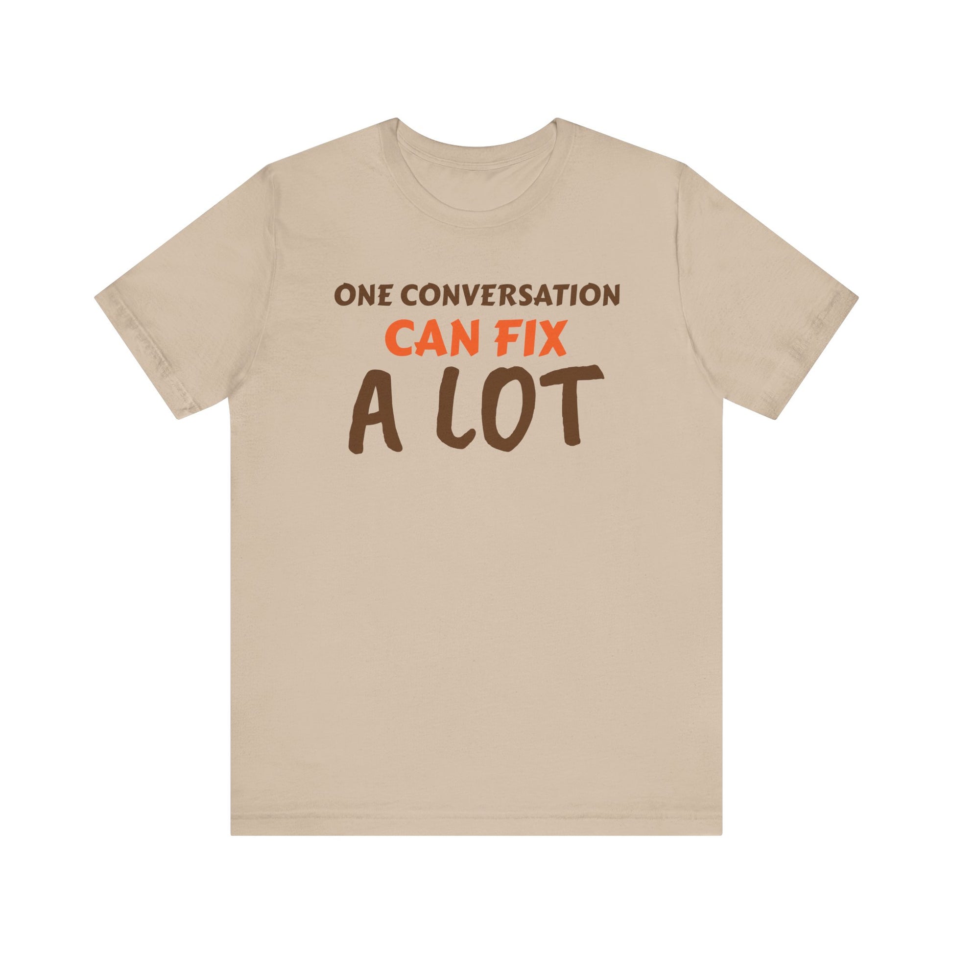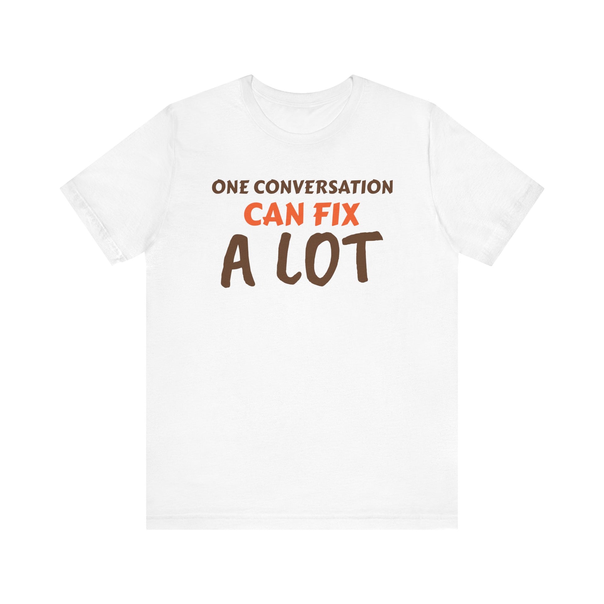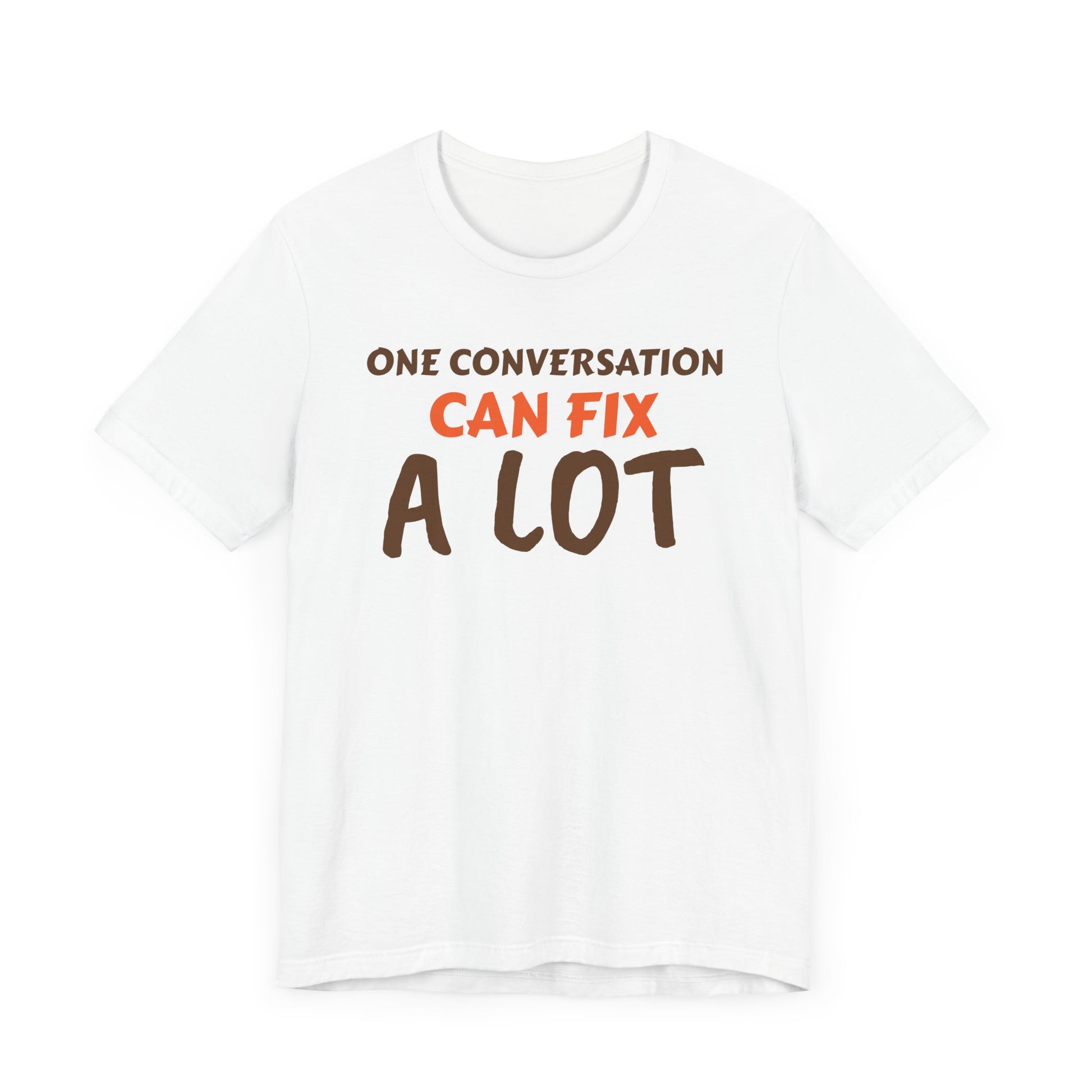 Introducing a versatile Unisex Jersey Short Sleeve Tee that seamlessly blends comfort and style. This tee encapsulates a relaxed yet polished vibe, making it perfect for everyday wear. Whether you’re lounging at home, heading out with friends, or looking for a casual outfit for a festive celebration, this tee has you covered. Its engaging message, "One Conversation Can Fix A Lot," resonates with those who value connections, making it a thoughtful gift for friends, family, or anyone looking to foster relationships. Ideal for casual gatherings, parties, or even as a conversation starter during social events. Perfect for holidays, birthdays, or simply to brighten someone's day.