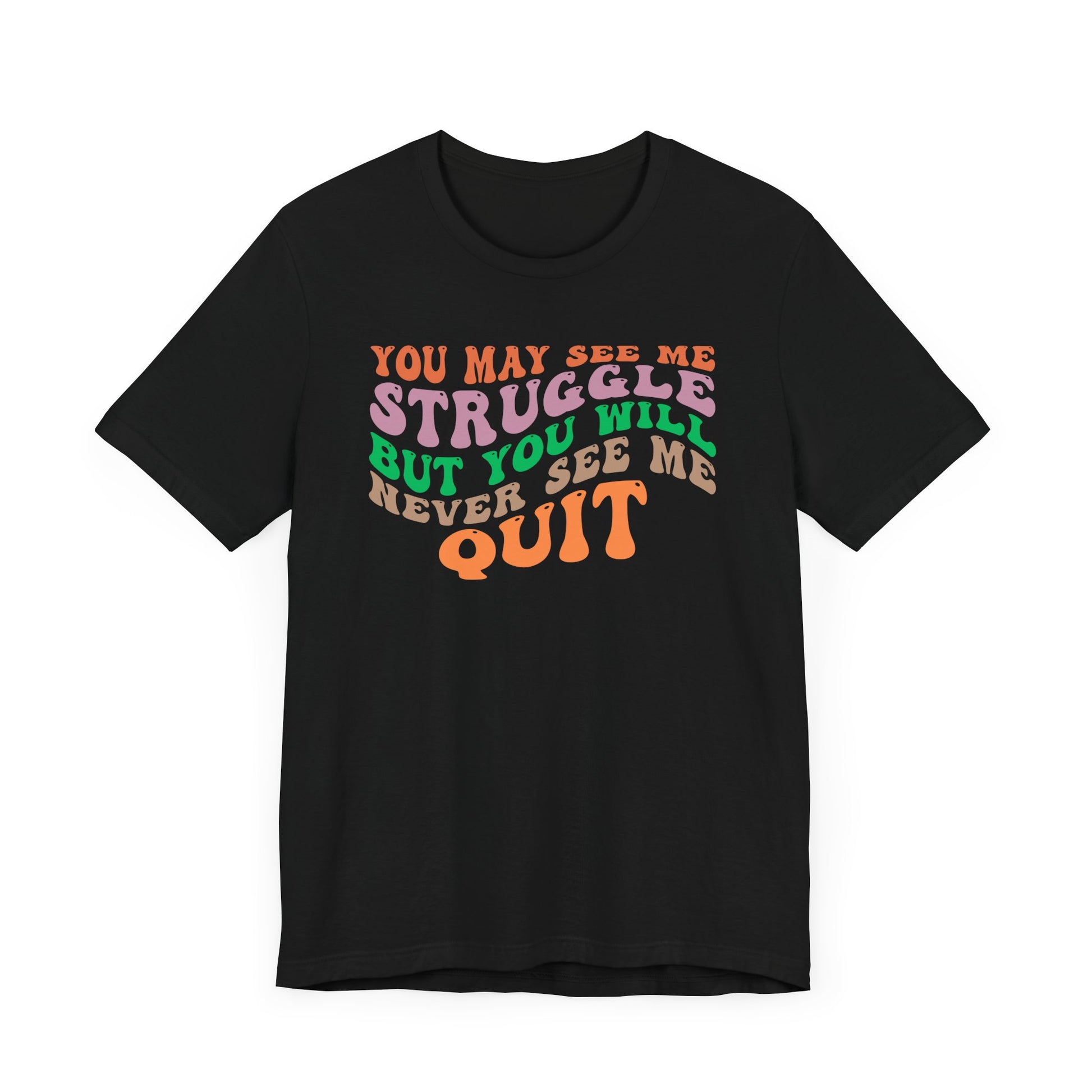Ce t-shirt à manches courtes unisexe en jersey présente le message inspirant « VOUS POUVEZ ME VOIR LUTTER, MAIS VOUS NE ME VOIREZ JAMAIS ARRÊTER ». Le tissu léger et la coupe ajustée le rendent parfait pour les vêtements de sport et de loisirs, ainsi que pour les tenues décontractées et semi-formelles. Idéal pour ceux qui apprécient le confort et la motivation dans leur garde-robe quotidienne. Convient pour des occasions comme les anniversaires, les séances de gym et les sorties décontractées.