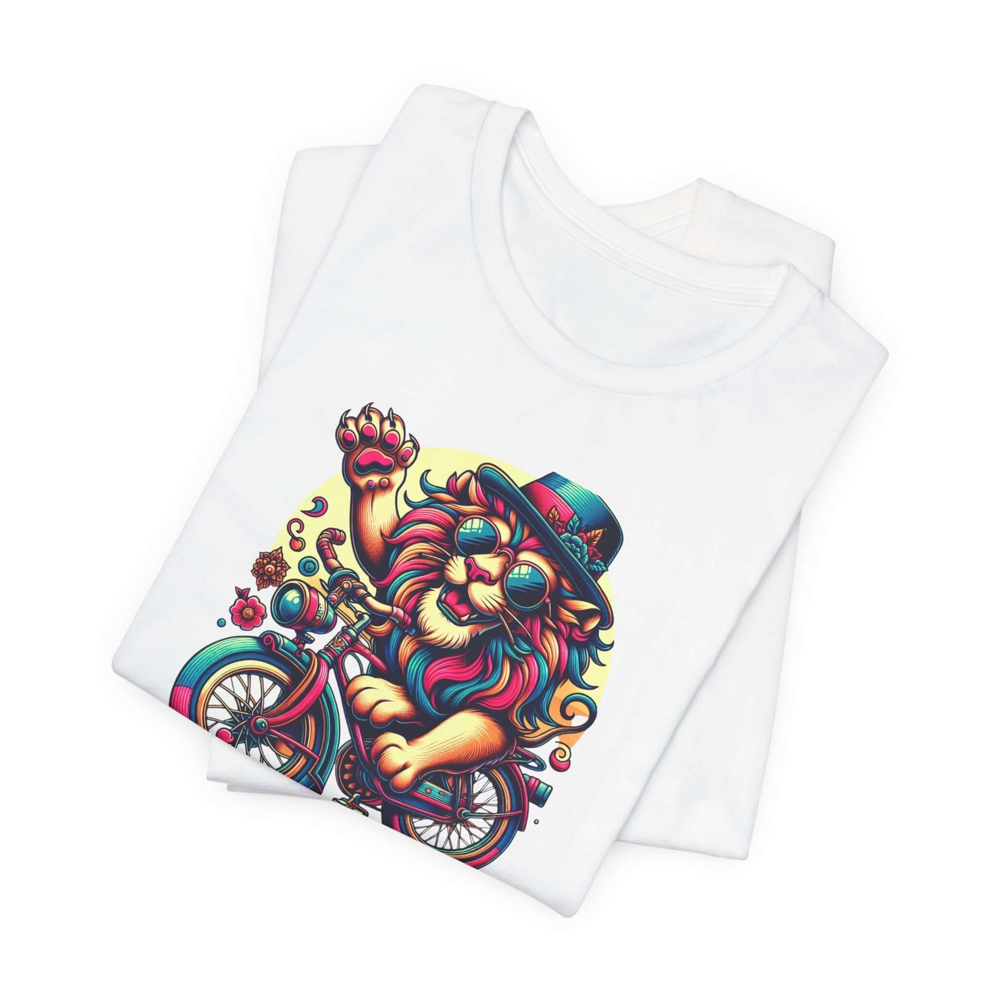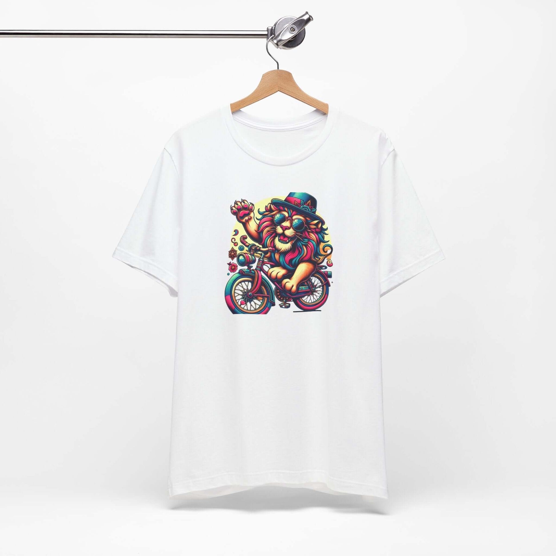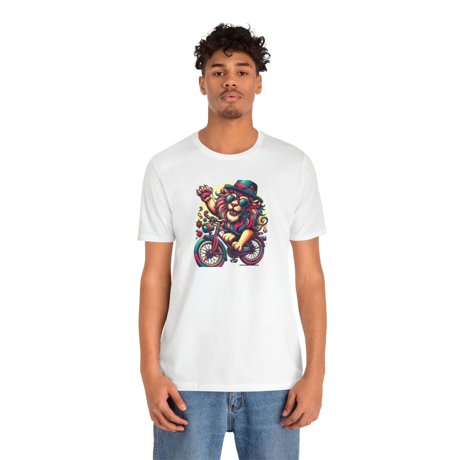 Introducing a vibrant Unisex Jersey Short Sleeve Tee that sparks joy and creativity! This eye-catching tee features an artistic lion on a bicycle, radiating a playful, carefree vibe that brightens up any outfit. Perfect for casual outings, music festivals, or simply lounging at home, this tee is an ideal choice for art lovers and free spirits alike. Wear it to celebrate summer days, outdoor events, or just because you want to express your unique style. The breathable fabric and classic fit make it suitable for all-day wear, offering both comfort and style. Great for birthdays, holidays, or just treating yourself to a fun addition to your wardrobe!