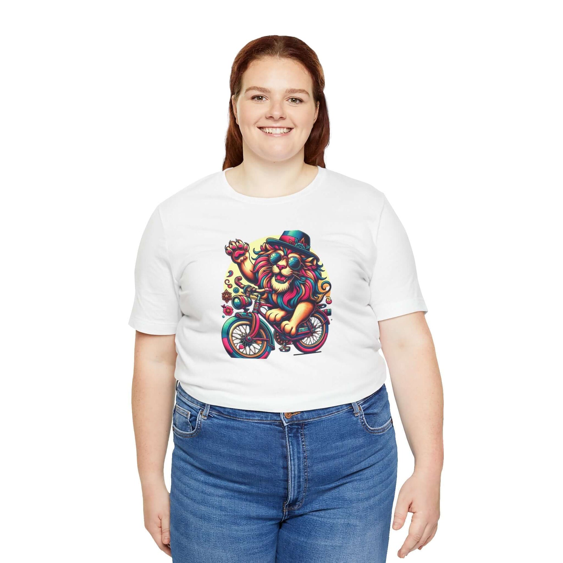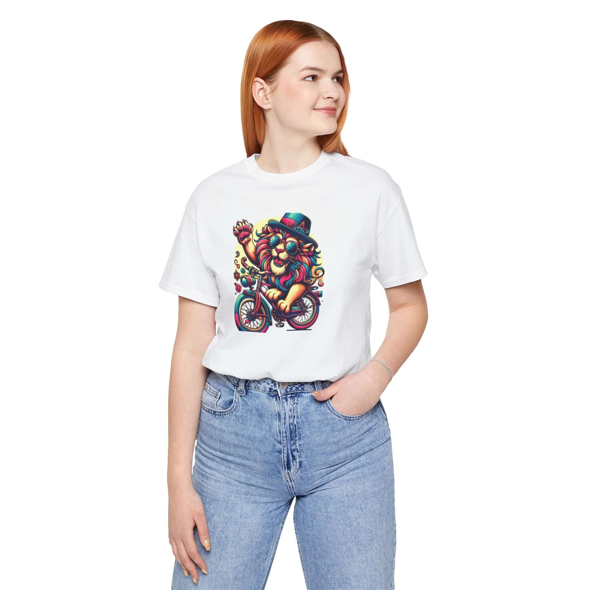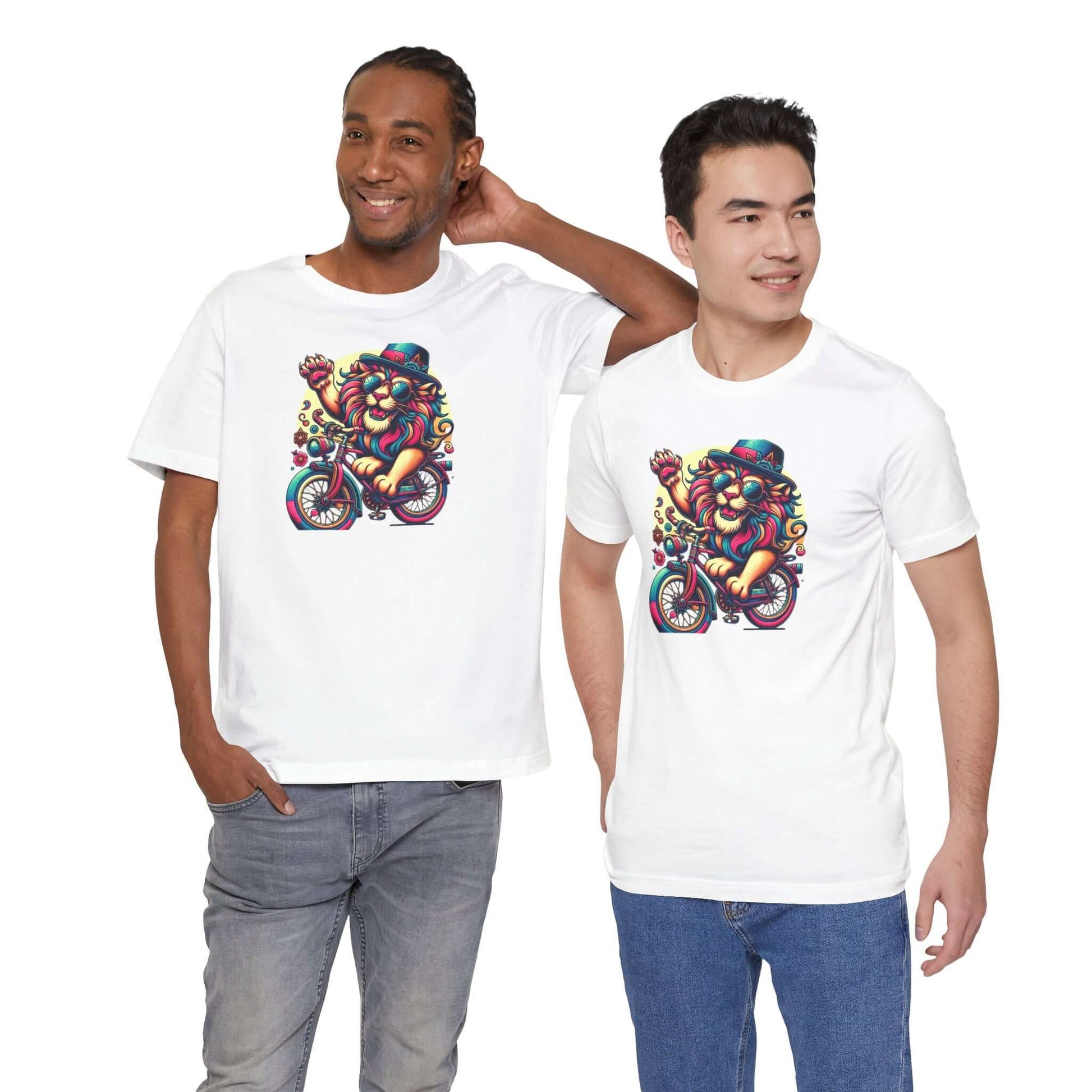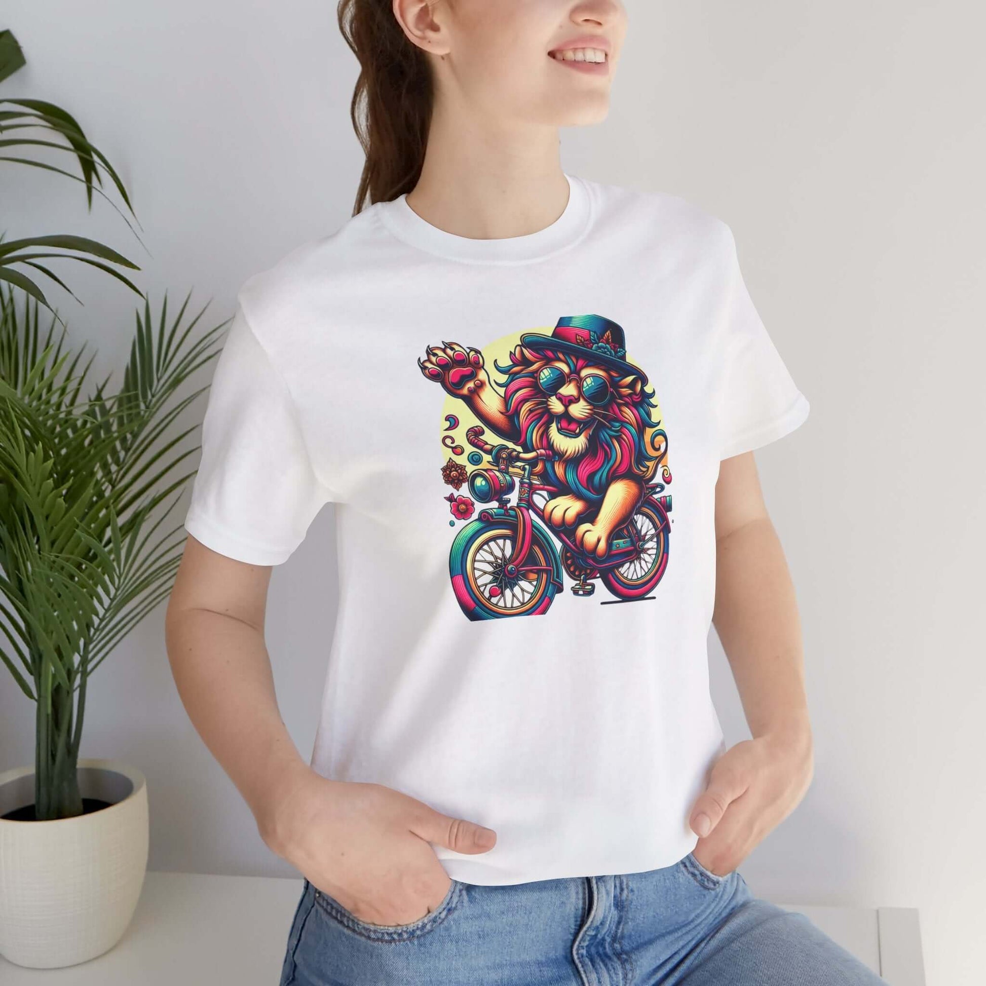Introducing a vibrant Unisex Jersey Short Sleeve Tee that sparks joy and creativity! This eye-catching tee features an artistic lion on a bicycle, radiating a playful, carefree vibe that brightens up any outfit. Perfect for casual outings, music festivals, or simply lounging at home, this tee is an ideal choice for art lovers and free spirits alike. Wear it to celebrate summer days, outdoor events, or just because you want to express your unique style. The breathable fabric and classic fit make it suitable for all-day wear, offering both comfort and style. Great for birthdays, holidays, or just treating yourself to a fun addition to your wardrobe!