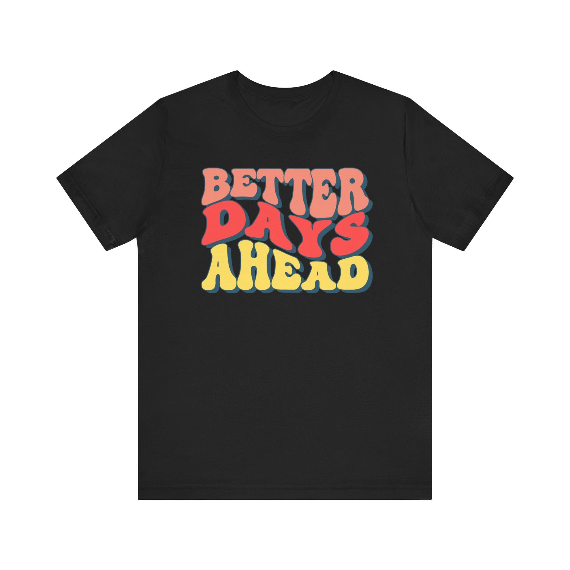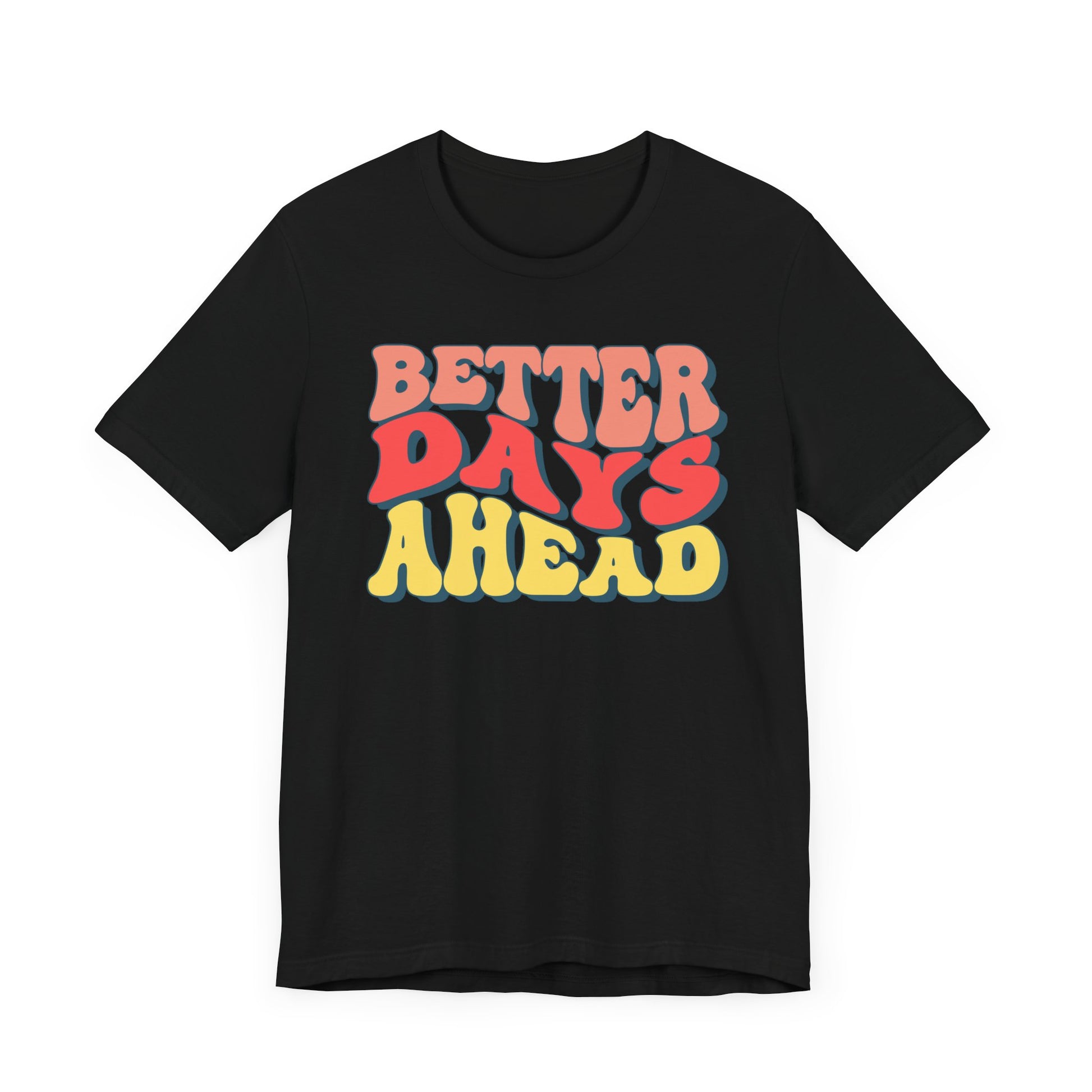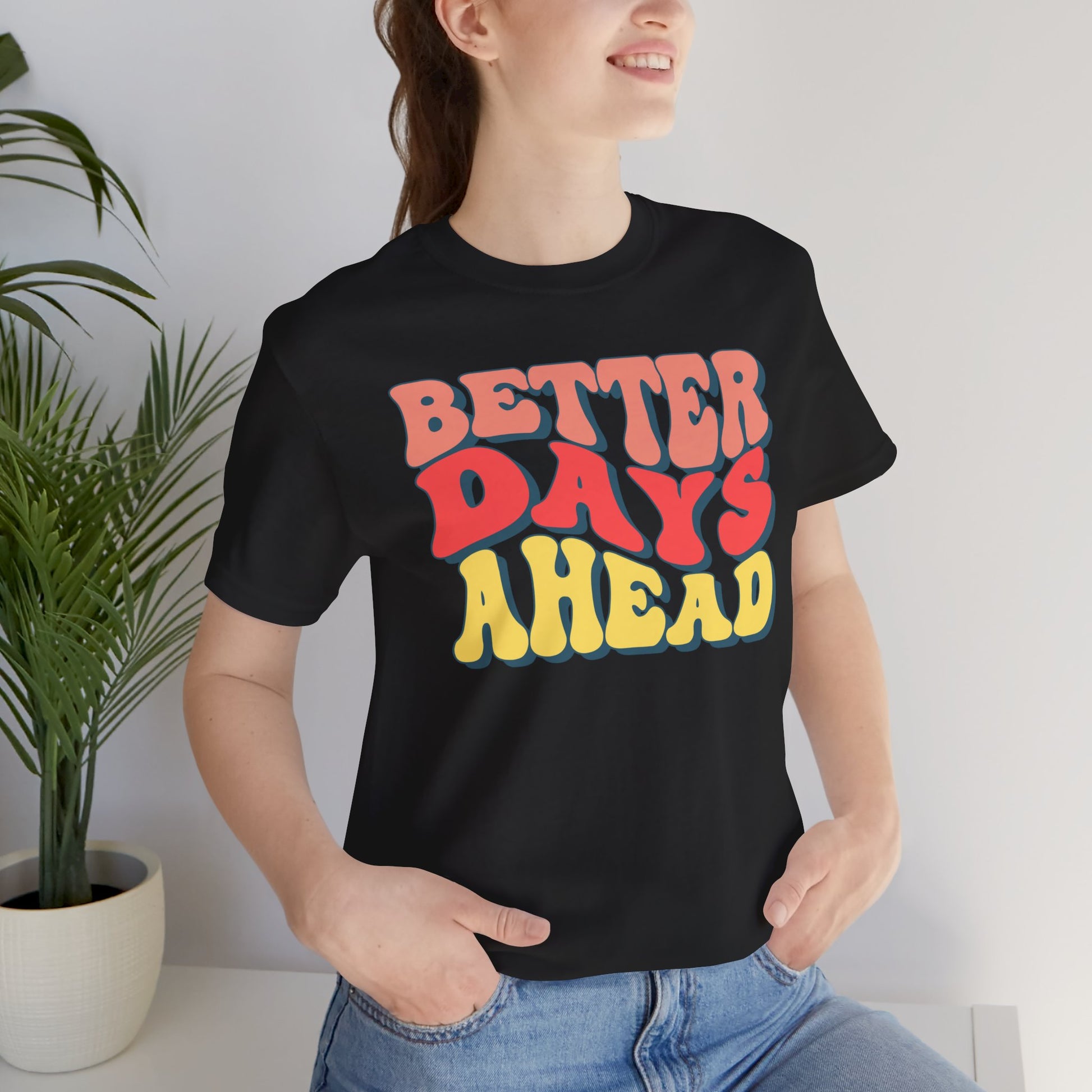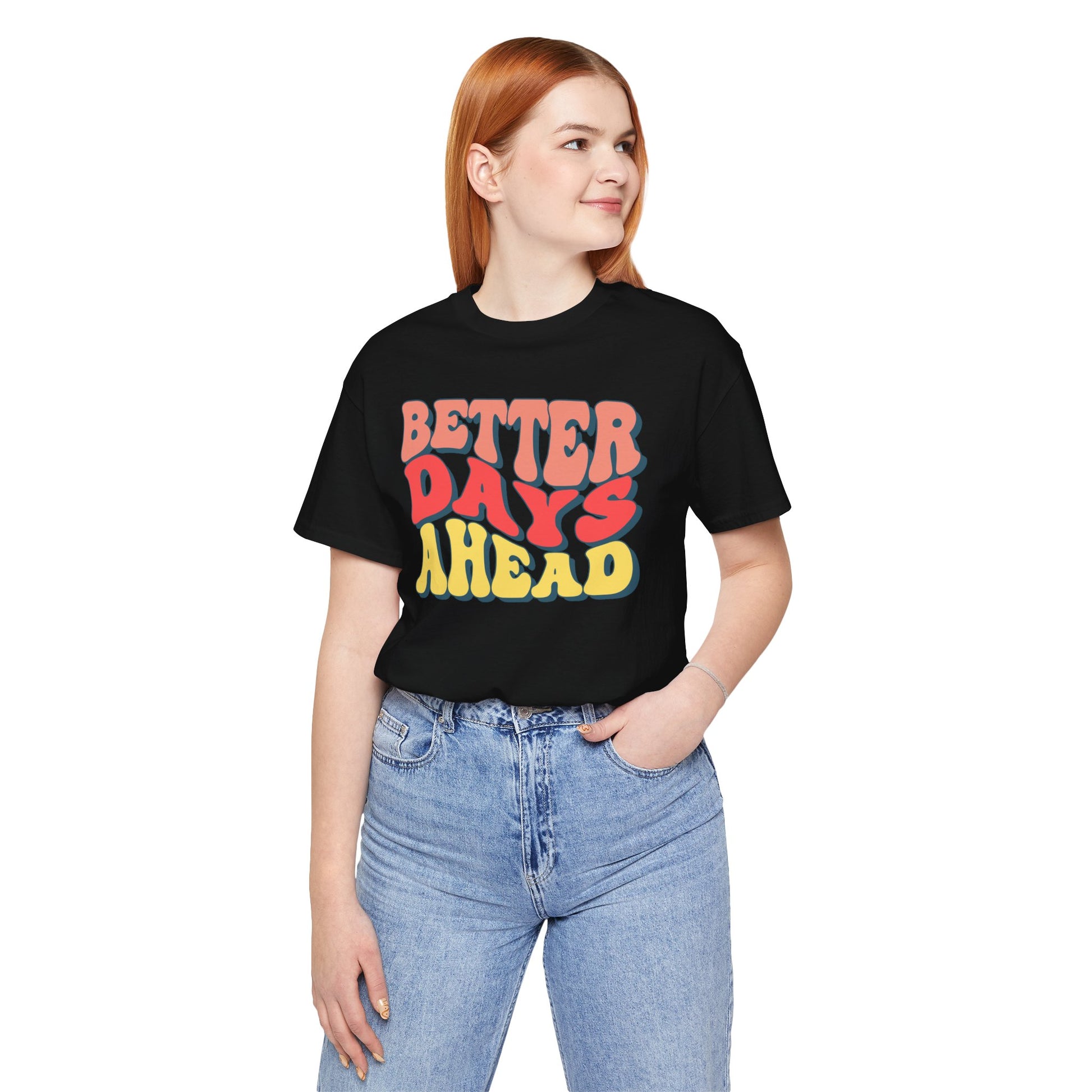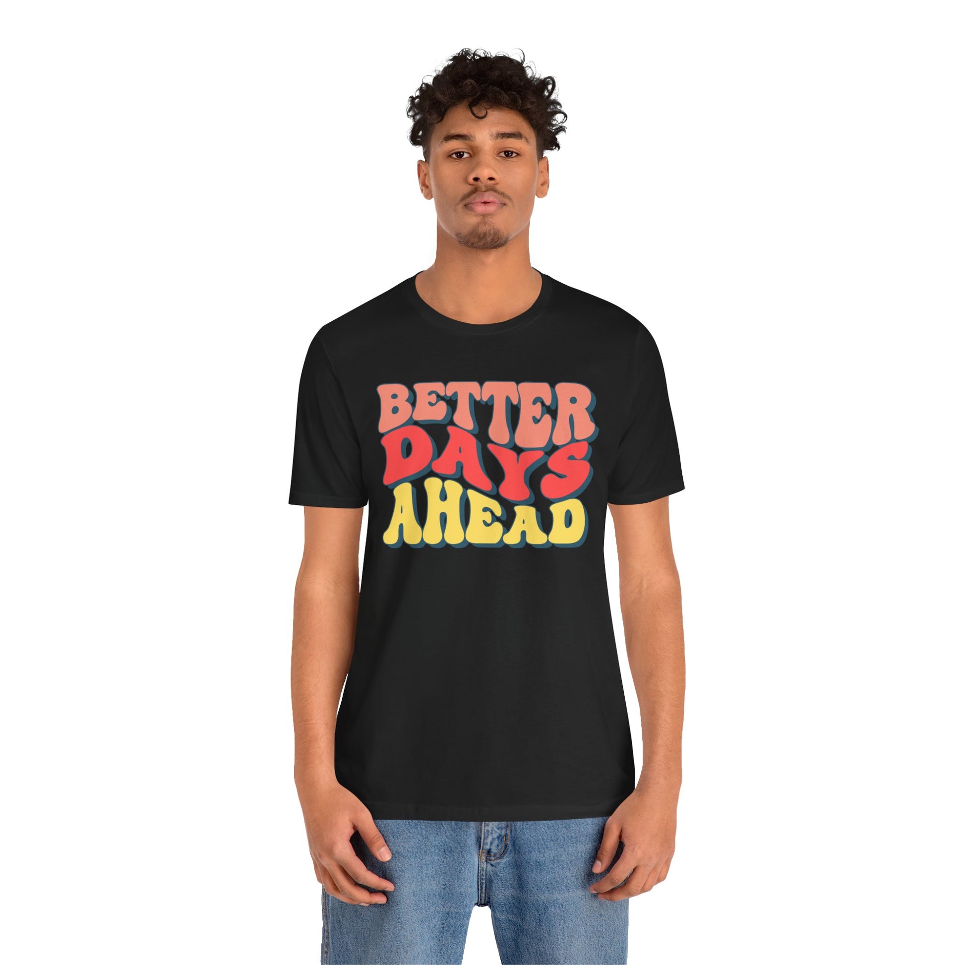 Better Days Ahead Unisex Short Sleeve Tee – Positive Vibes T-Shirt. This t-shirt exudes positivity and optimism, perfect for those seeking motivation and good vibes in their everyday life. The relaxed fit and comfortable fabric make it ideal for casual wear or lounging around. Relevant for individuals looking to add a touch of positivity to their wardrobe, suitable for casual outings, exercising, or simply uplifting your spirits during difficult times.