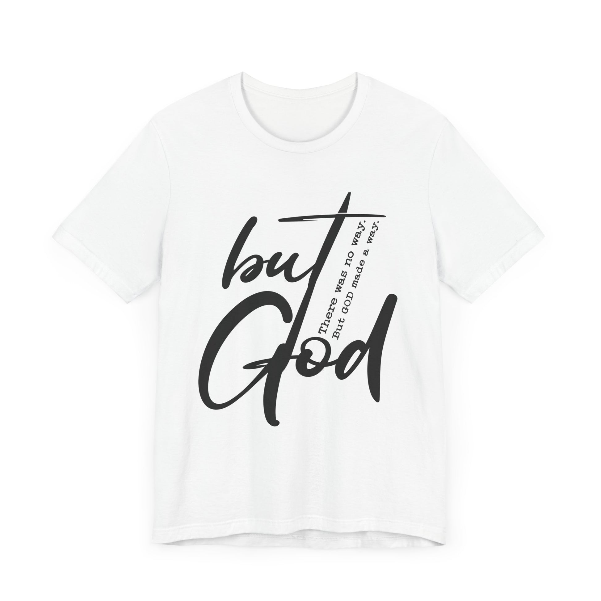 Un t-shirt à manches courtes unisexe classique en jersey avec la phrase « But God » imprimée sur le devant. Le tissu léger et la coupe ajustée le rendent parfait pour les tenues décontractées et semi-formelles. Idéal pour celles qui recherchent une pièce confortable et élégante à superposer ou à porter seule.