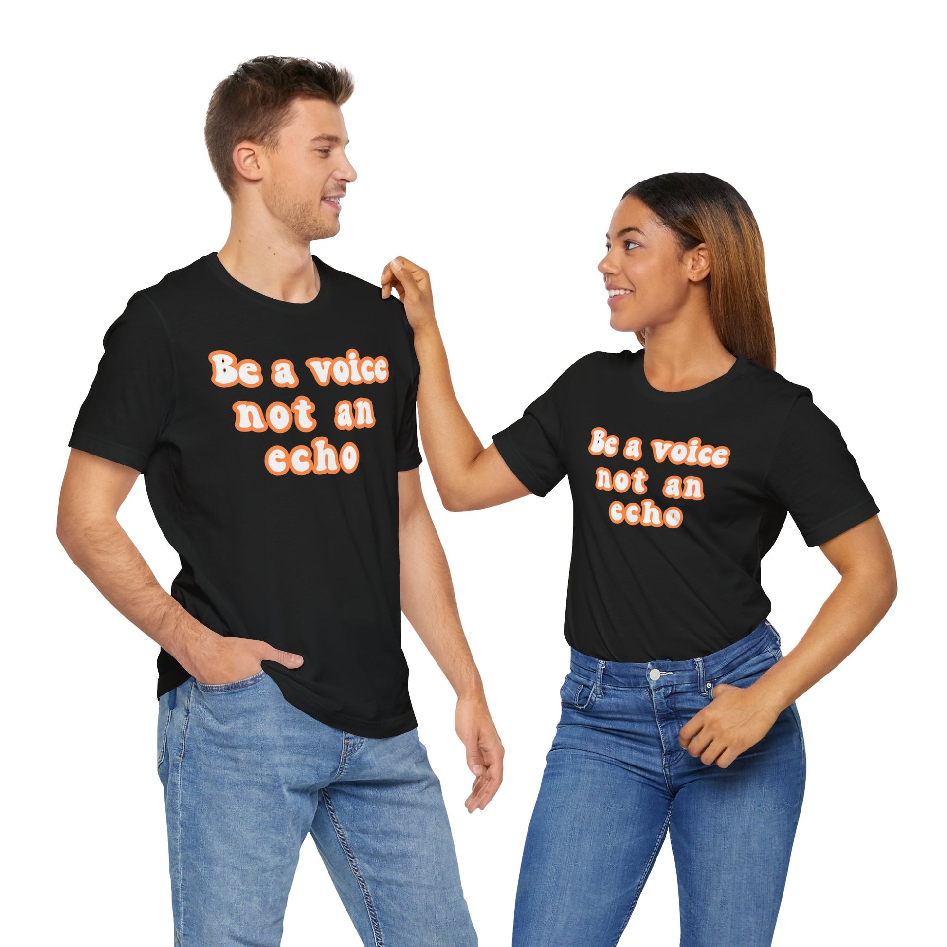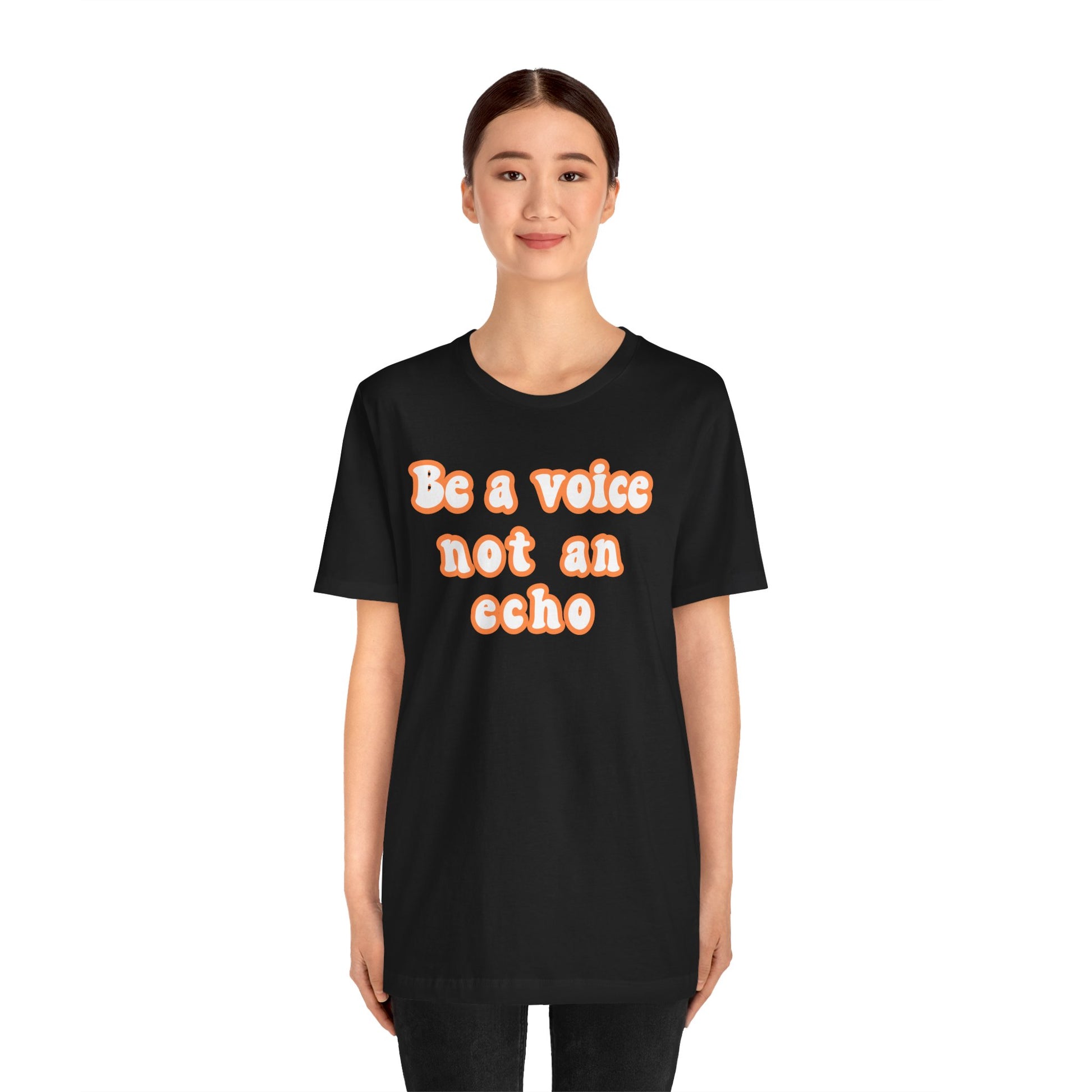 This Unisex Jersey Short Sleeve Tee offers a classic yet stylish look, perfect for casual and semi-formal settings. Made with 100% Airlume combed and ring-spun cotton, this lightweight fabric is ideal for layering and staying comfortable throughout the day. The design 'BE A VOICE NOTE AN ECHO' gives a trendy and empowering vibe, making it a great choice for individuals looking to make a statement. Express delivery available. Relevant for those celebrating special occasions, holidays, or those who just want to express themselves through fashion.