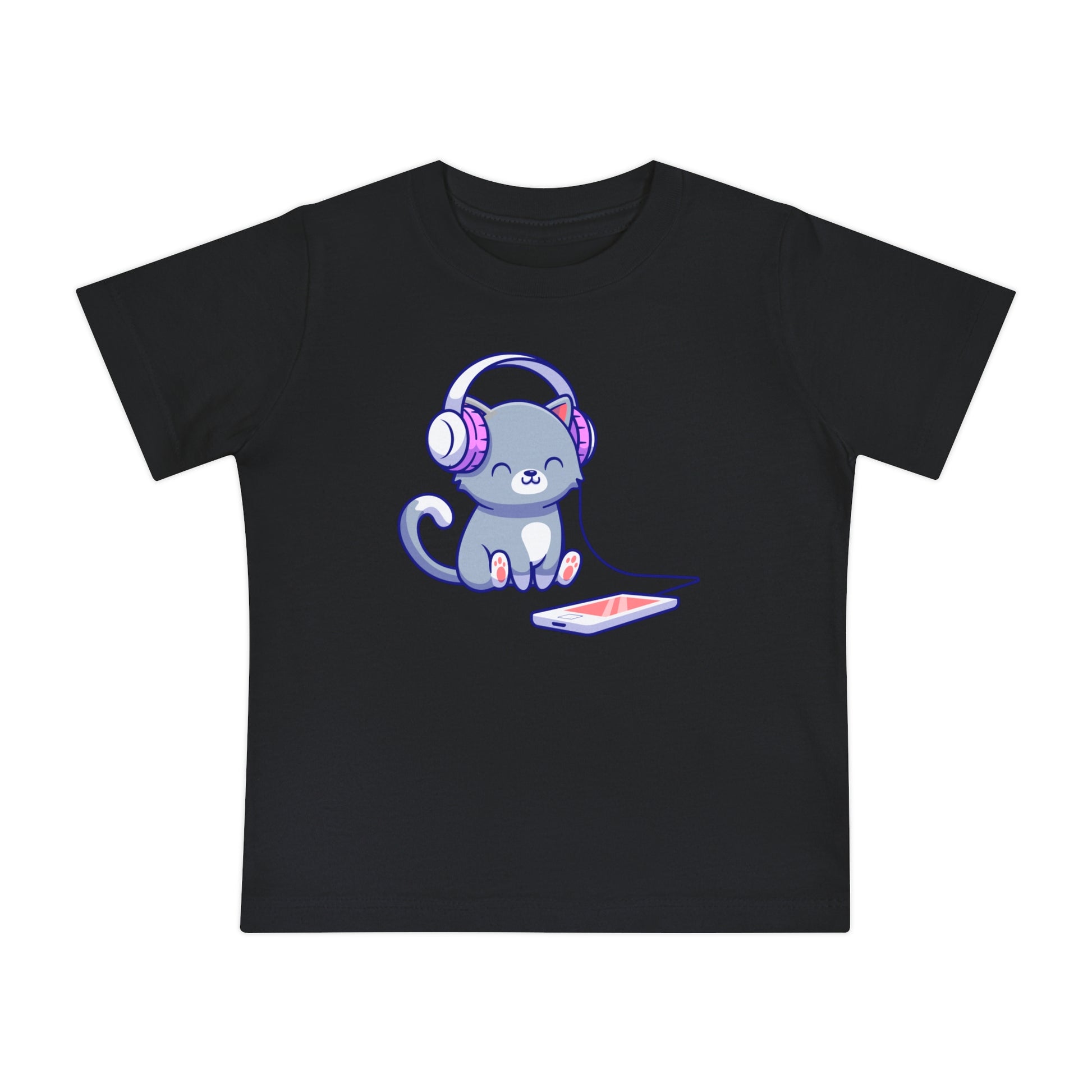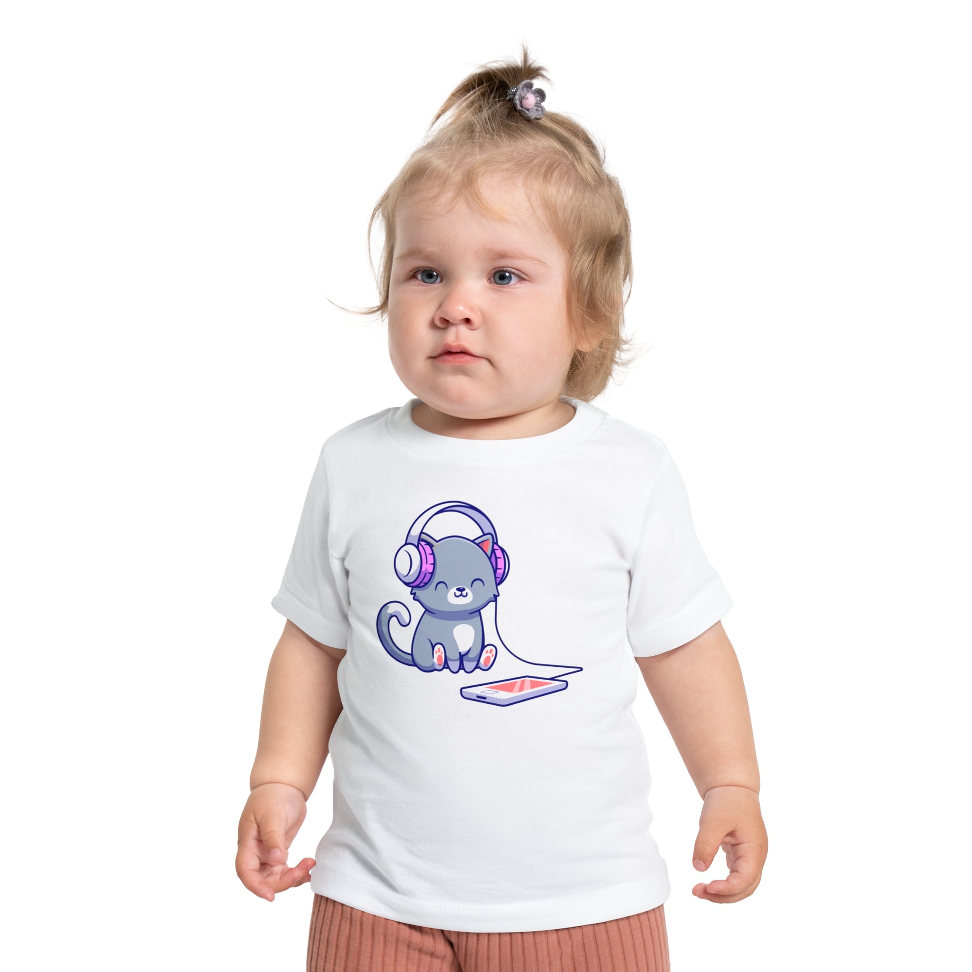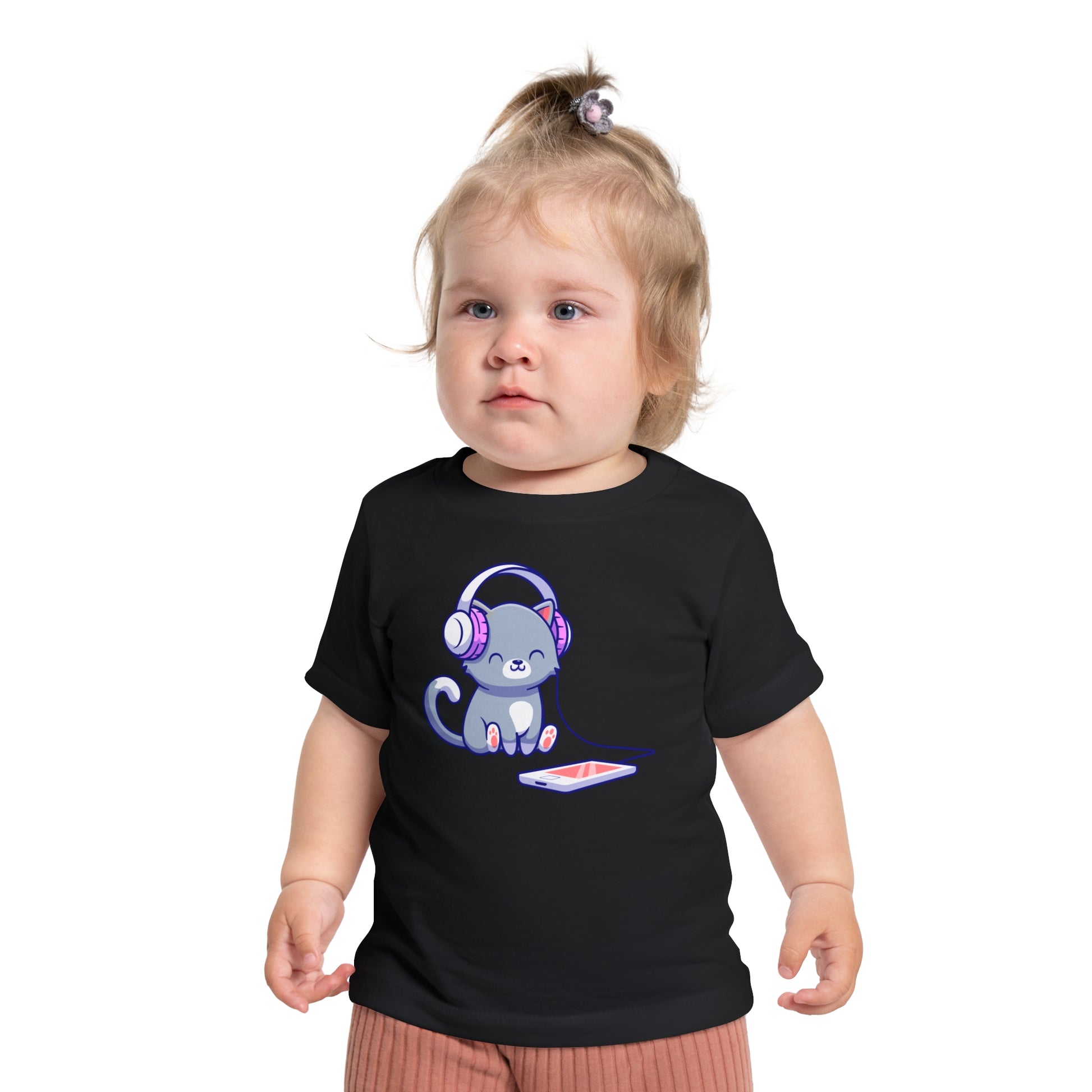 Cute Cat Listening to Music Baby T-Shirt | Playful Short Sleeve Tee for Kids