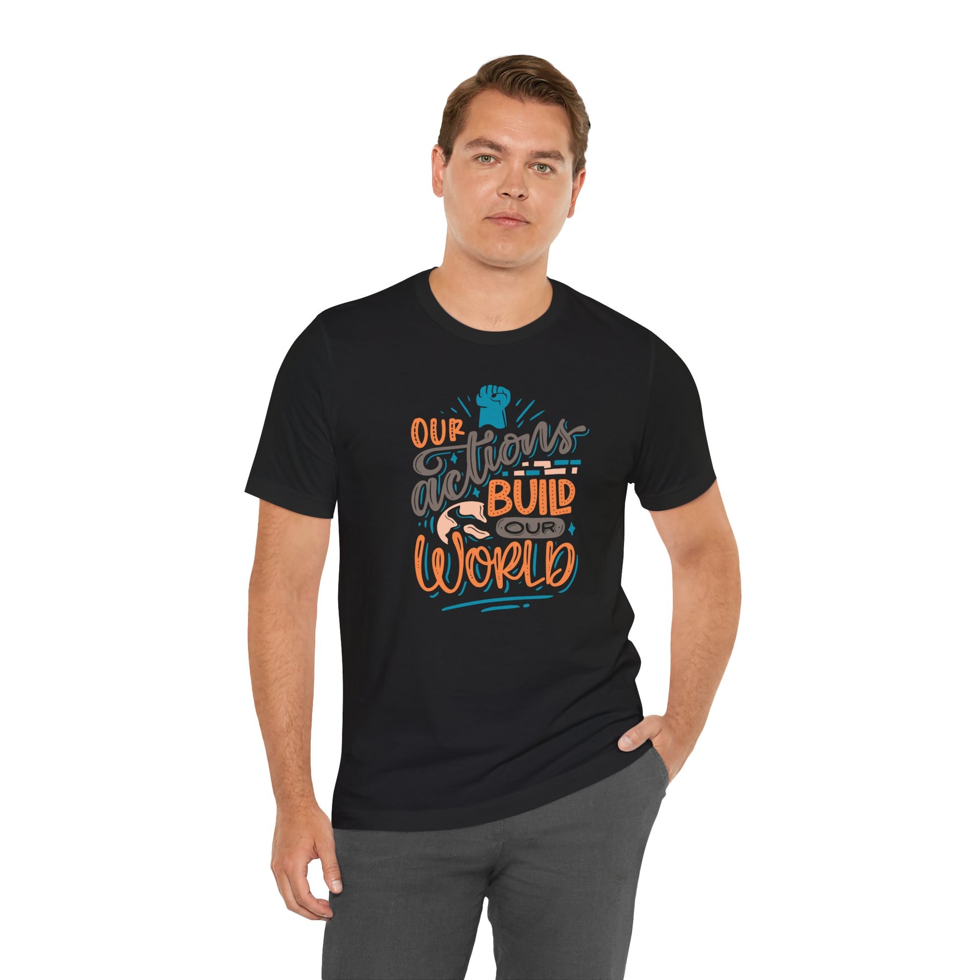 This Unisex Jersey Short Sleeve Tee features a powerful message, 'OUR ACTIONS BUILD OUR WORLD', making it a perfect statement piece for those who are passionate about making a difference. The lightweight and breathable fabric makes it ideal for both active and leisure wear, while the retail fit and classic crew neckline allow for easy styling in casual and semi-formal settings. This tee is relevant to individuals who value sustainability, social responsibility, and activism, making it a great choice for Earth Day, social justice events, and everyday wear.