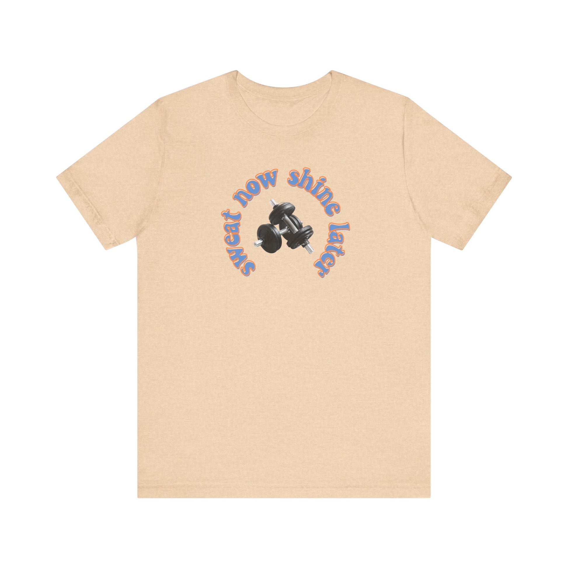 A comfortable and breathable T-Shirt featuring a design that says 'sweat now shine later', perfect for those who love fitness and motivation. This T-Shirt is ideal for activewear and casual wear, adding a stylish touch to any outfit. Great for people who enjoy working out and staying motivated for their fitness goals. Perfect for gifting during birthdays, holidays, or any occasion.