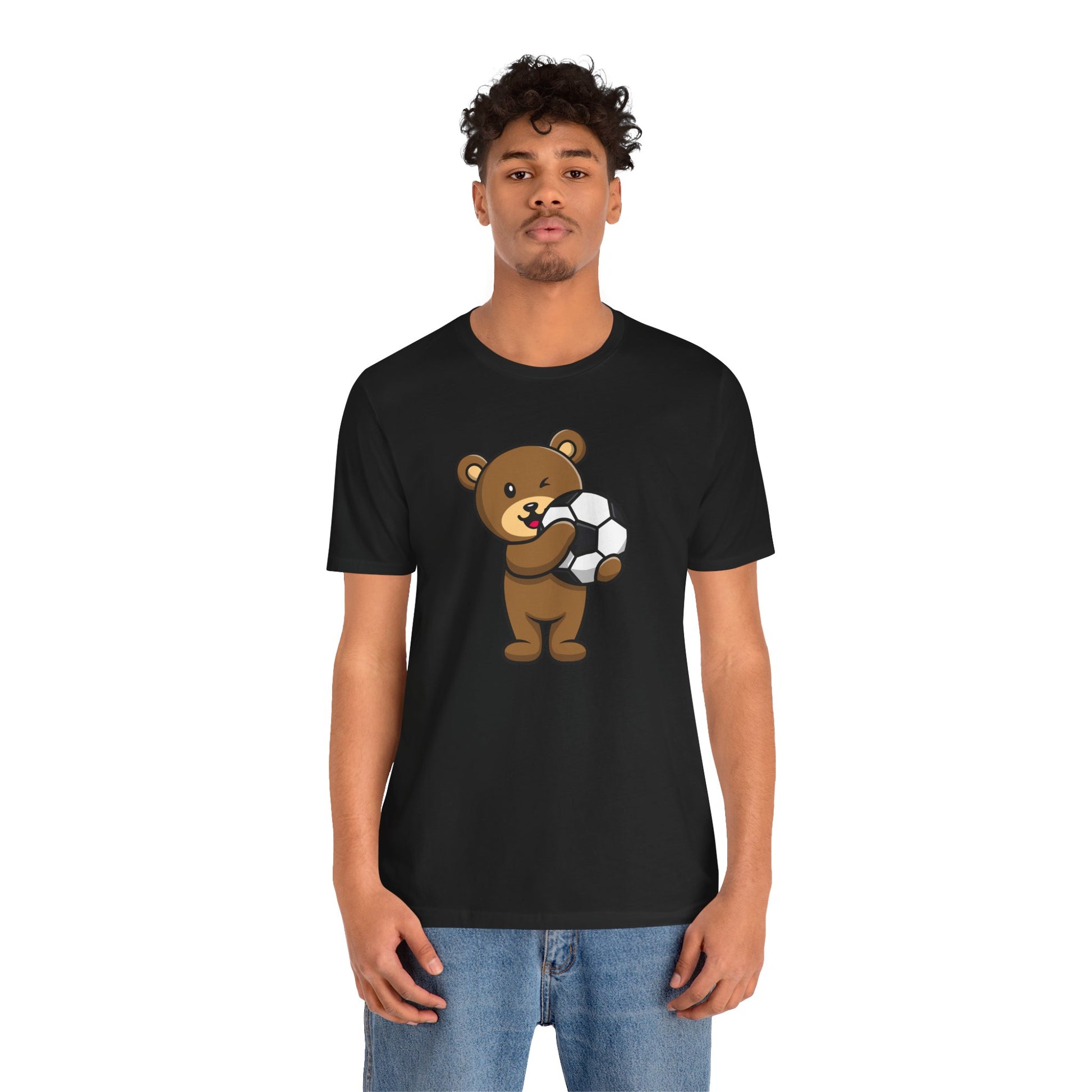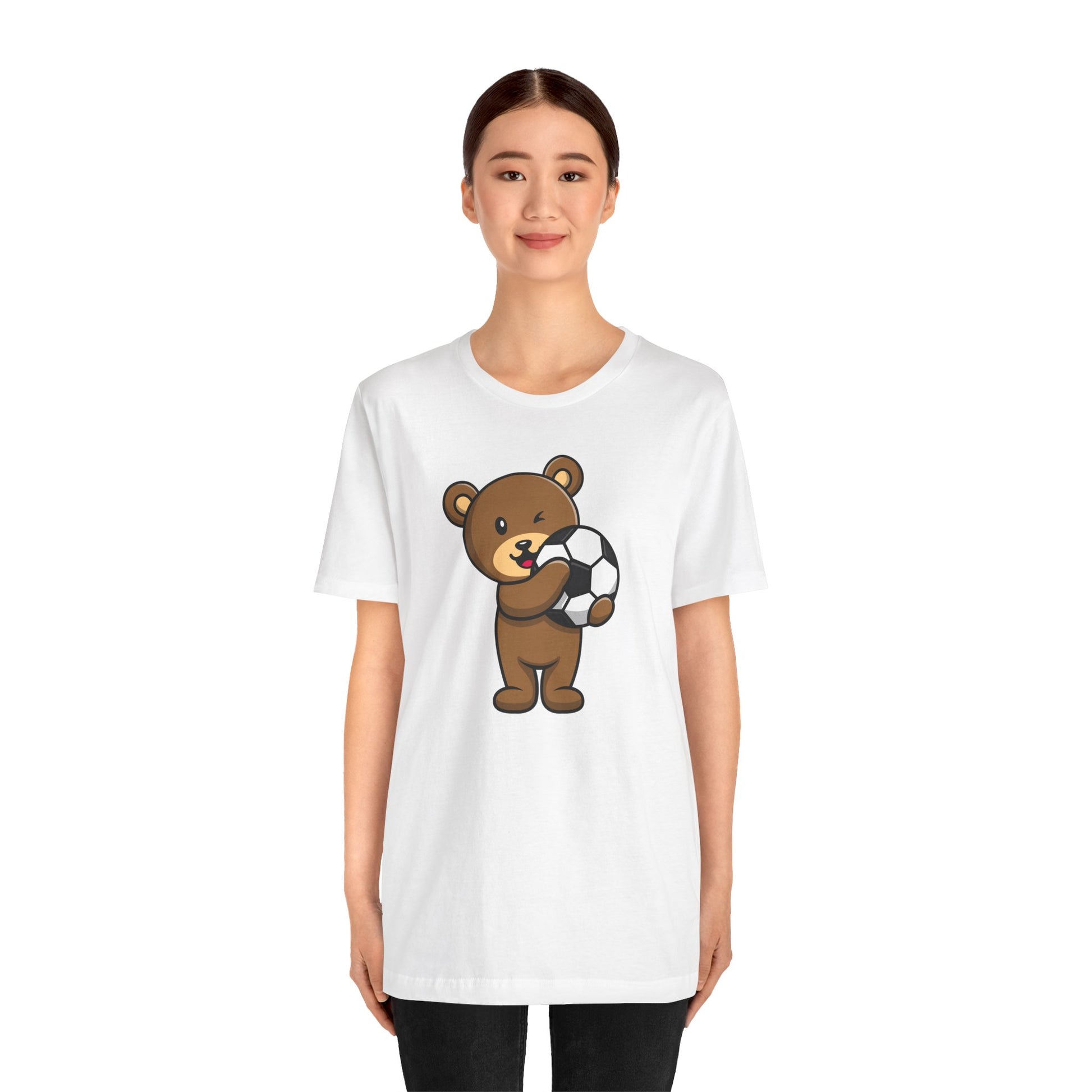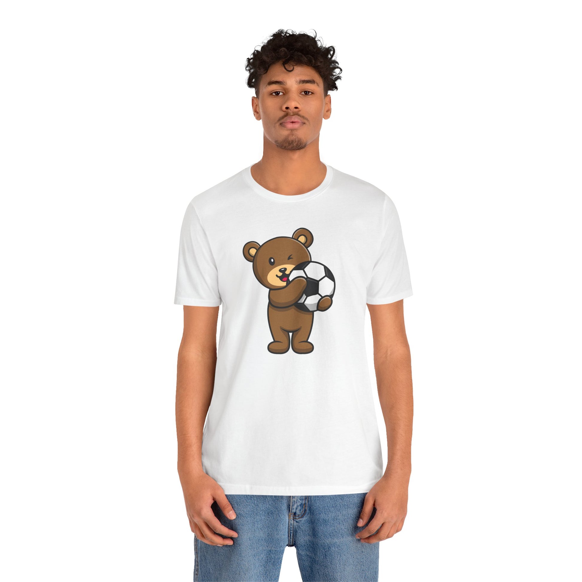 This Unisex Jersey Short Sleeve Tee with Teddy Bear Football Soccer design is perfect for sports enthusiasts and fans looking for a casual yet stylish outfit. The express delivery option makes it a great last-minute gift for birthdays or holidays. Made with 100% Airlume combed and ring-spun cotton, this lightweight tee is breathable and easy to layer, making it ideal for both active and leisure wear.