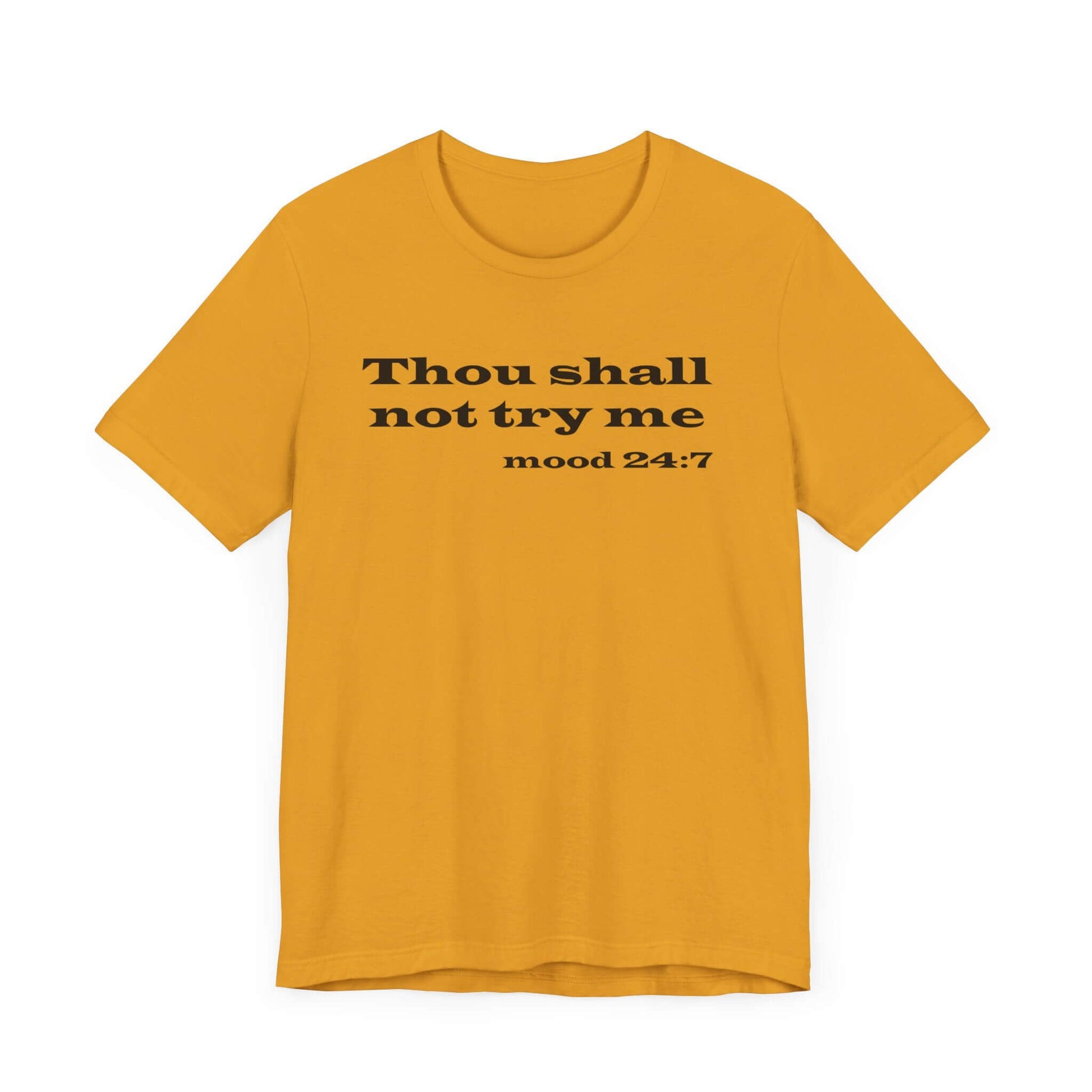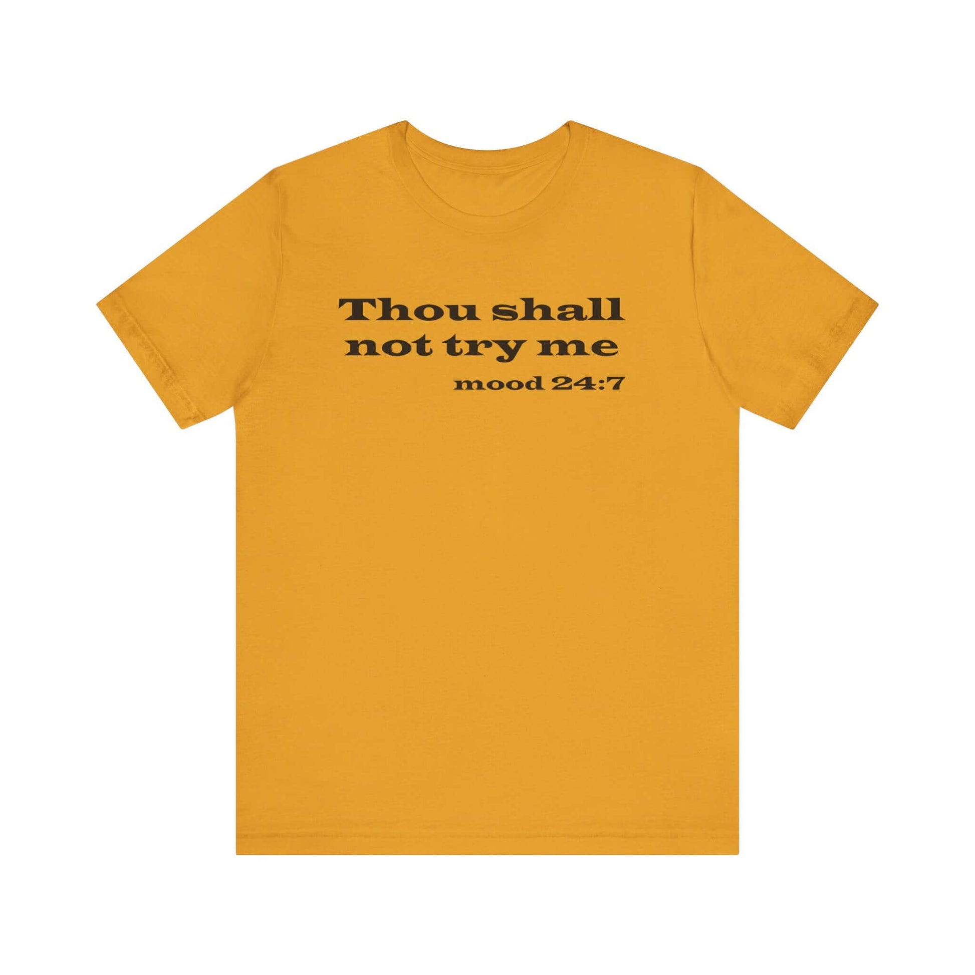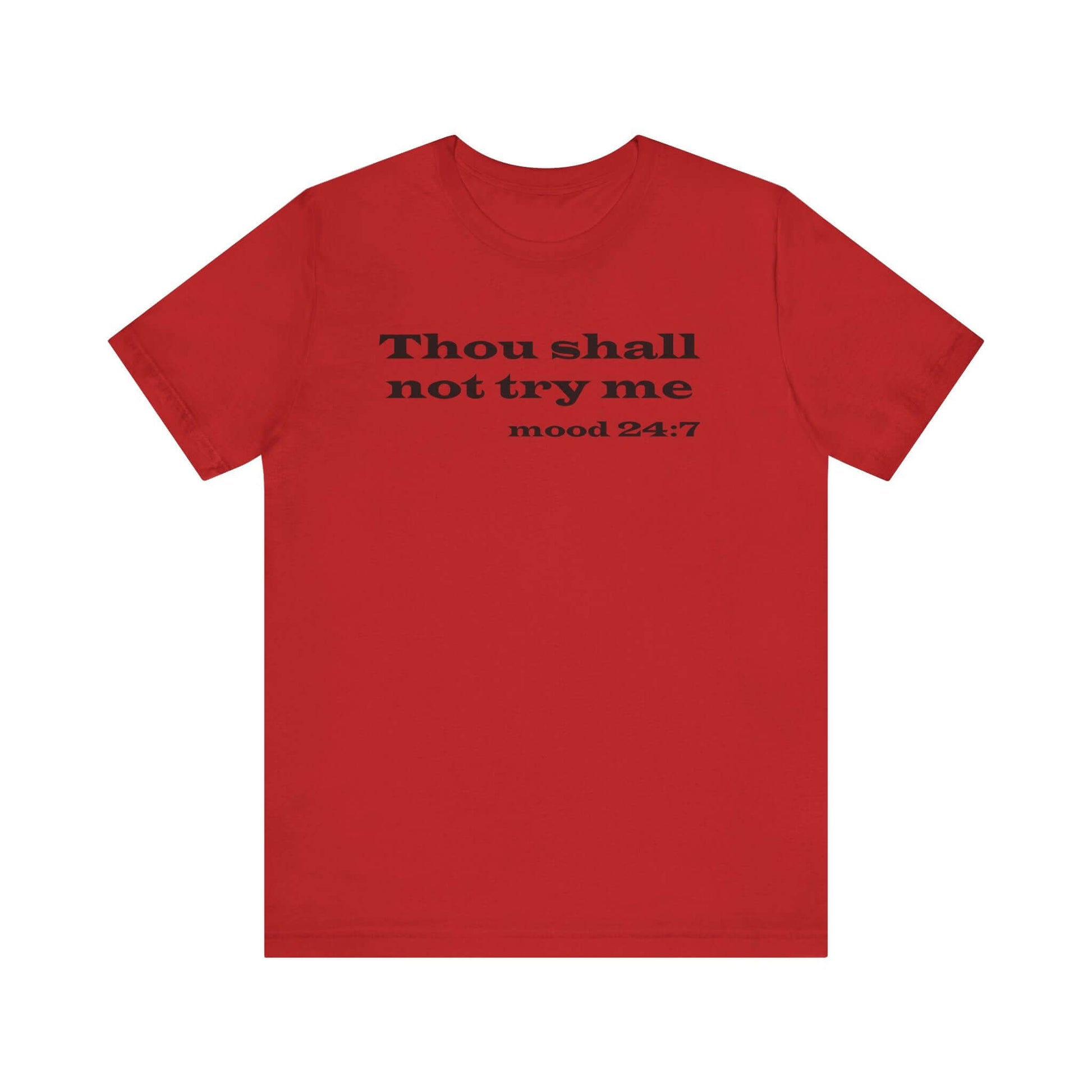A 'Thou Shall Not Try Me' unisex short sleeve tee that exudes a sassy and confident vibe. Perfect for those who want to make a statement while staying comfortable. Ideal for casual wear or as a conversation starter at gatherings or events. Relevant for individuals looking for a unique and bold piece to express their personality. Suitable for occasions such as casual outings, parties, or everyday wear.